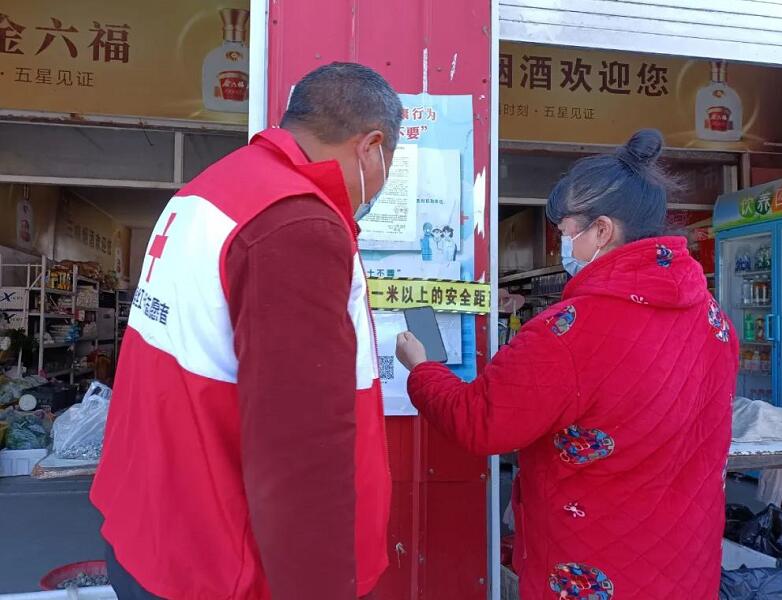 河口镇红十字会志愿者们进村入户,走访群众,将疫情防控科普宣传册等资料发给过往的每一个人手中,并叮嘱大家继续加强自我防护,戴口罩,勤洗手,少聚集。在人员流动较大的商超、药店等重点人员聚集场所,全方位督查督日常疫情防控措施落实到位,用实际行动筑起战“疫”堡垒。