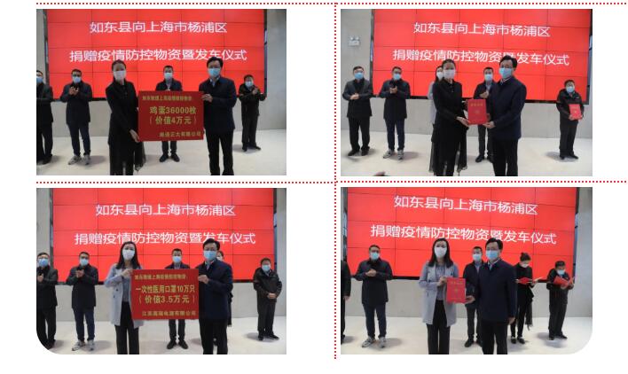 “疫情无情,人间有爱。”“防控攻坚,八方支援。”此轮疫情爆发以来,我县社会各界迅速响应、奉献爱心,向疫情防控伸出了友爱之手,汇聚了阵阵暖流。赛立特、南通正大、海宝电池、嘉通能源等一大批企业,在克服自身困难、发展生产的同时,积极履行社会责任,再次挺身而出、捐款捐物,展现了新时代‘张謇式’如商胸怀大局、自强不息、海纳百川的精神风貌,也体现了我县广大企业家热爱社会、服务社会、回报社会的高尚品格。”在向上海市杨浦区捐赠疫情防控物资暨发车仪式上,如东县委常委、组织部长、统战部长杨忠说。