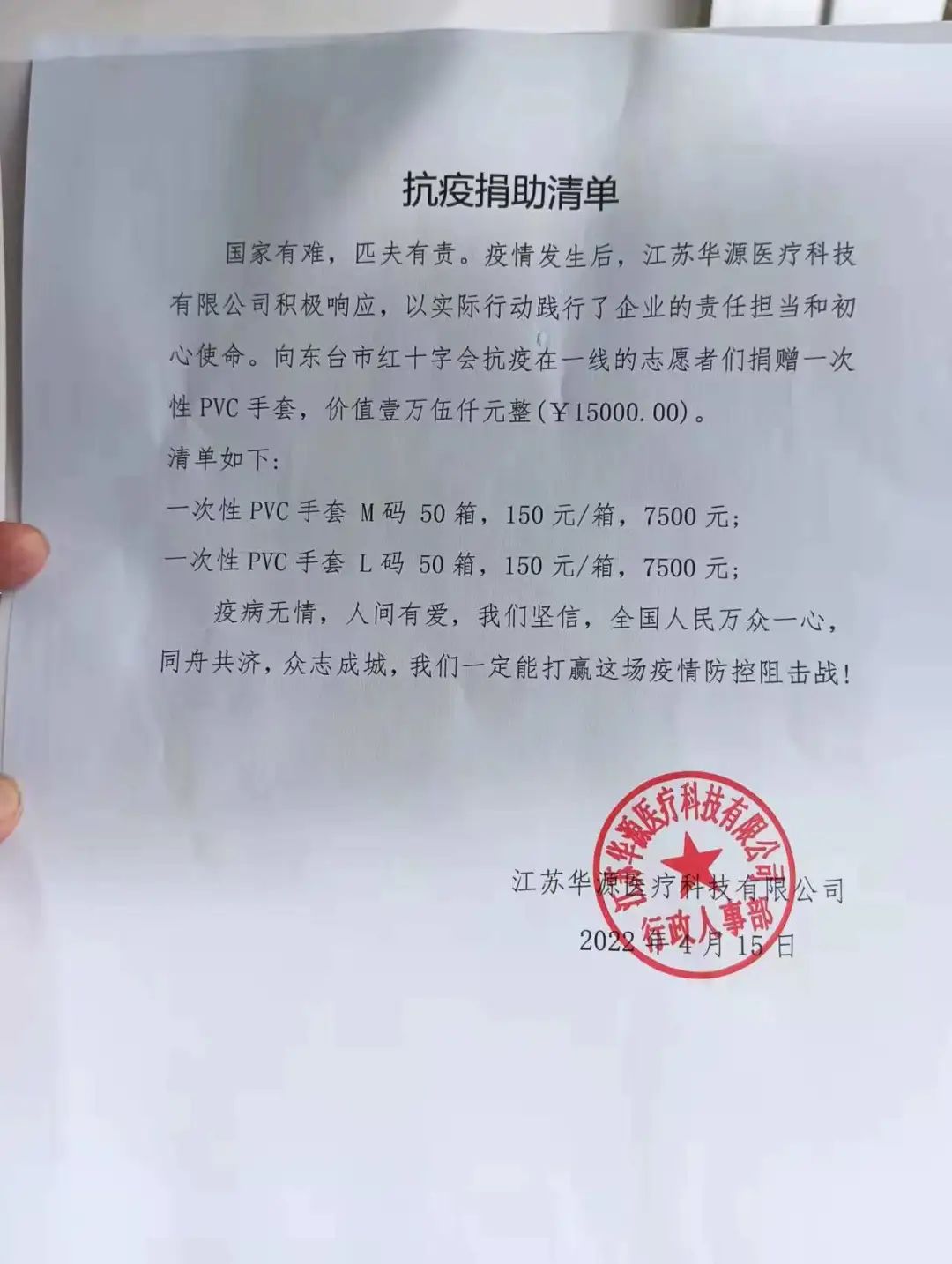 4月15日上午,江苏华源医疗科技有限公司向东台市红十字会捐赠100箱10万只一次性PVC手套。随后东台市红十字会向东台市共青团委员会转赠10箱手套,东台市文明办2箱手套,其余作为疫情防控和备灾救灾物资储备。