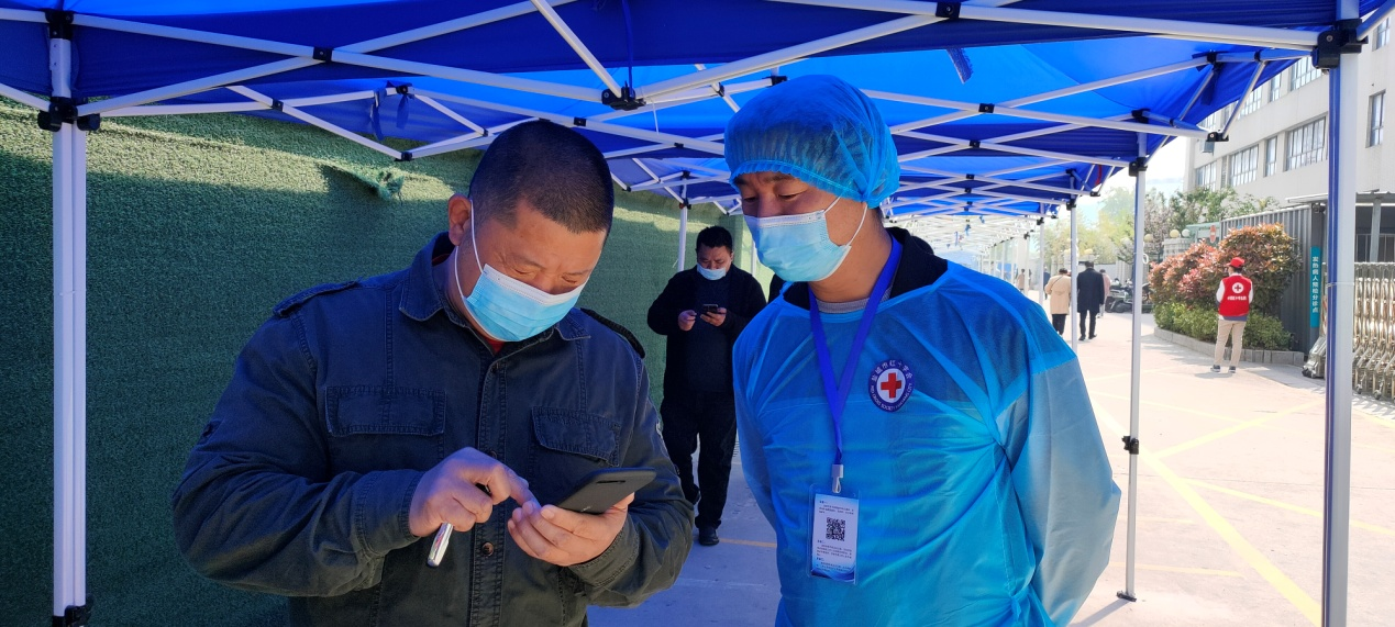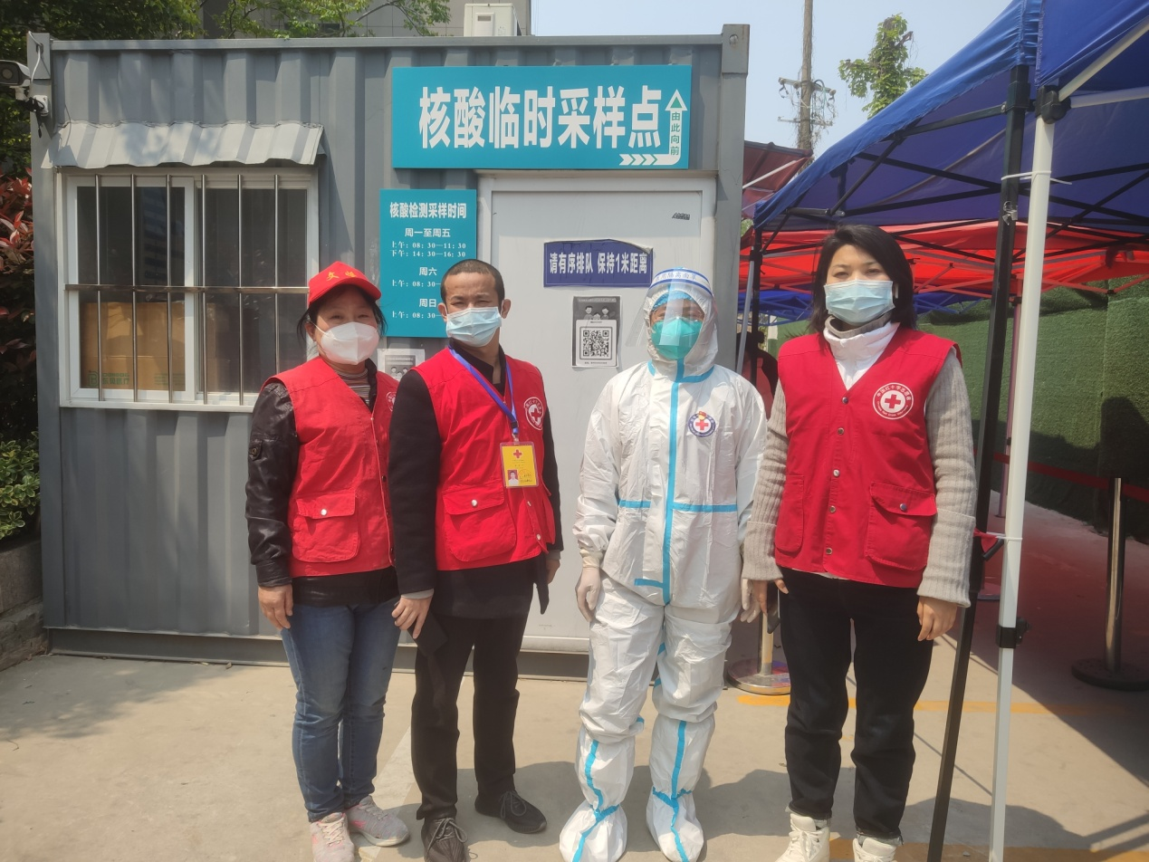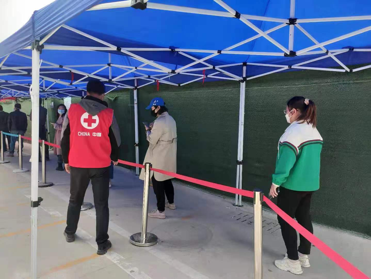 在核酸采样点现场,红十字志愿者引导群众、维持秩序、测温差码,协助医务人员核酸采样,保障整个采样过程顺利进行。