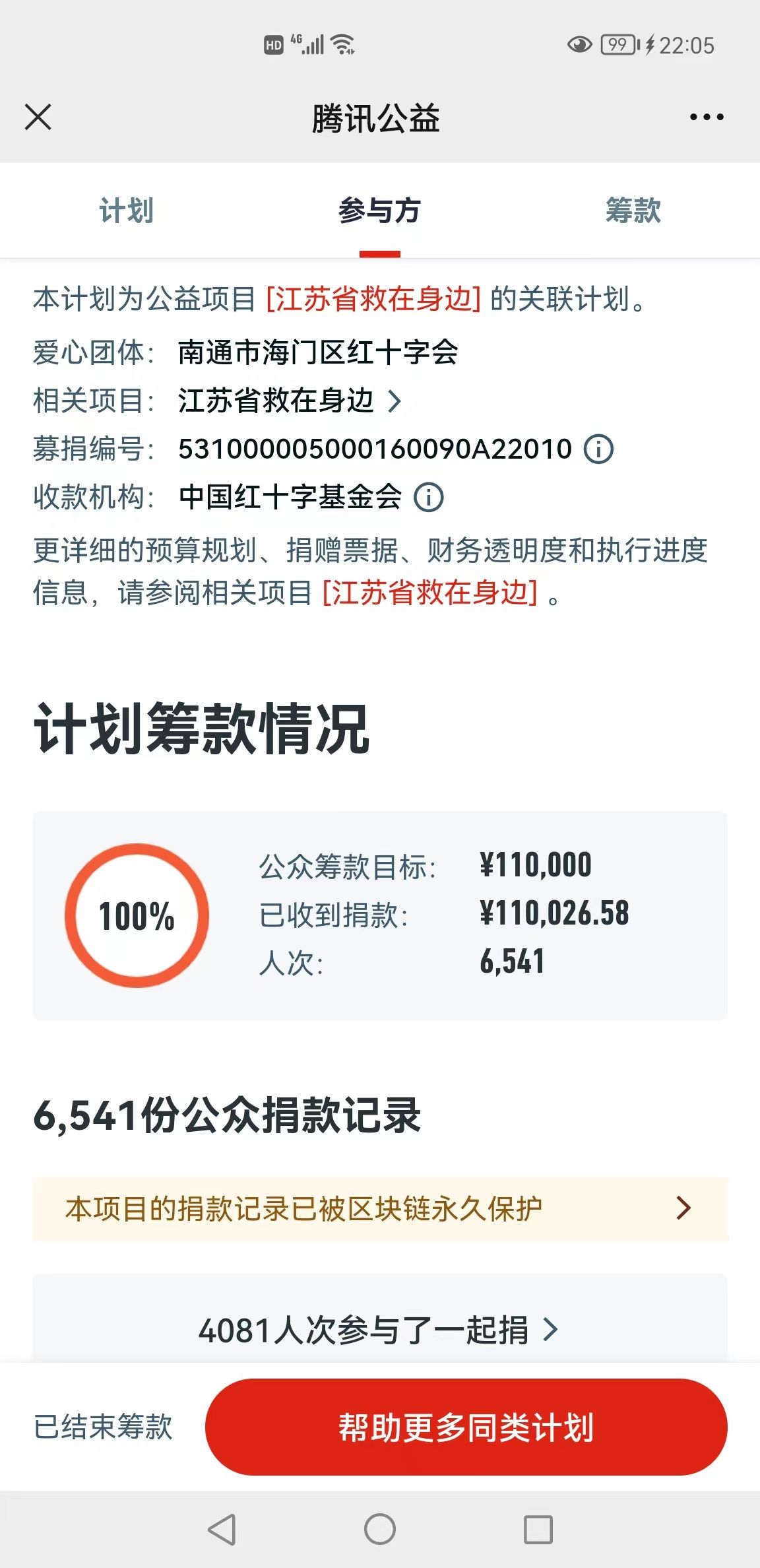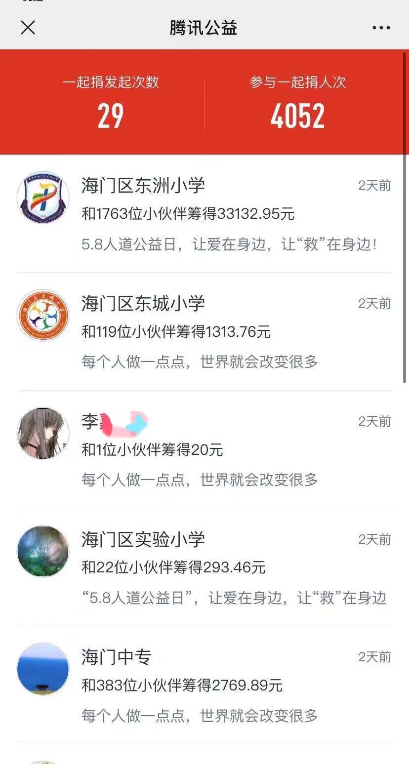 从4月21日17时16分“海门区救在身边”子计划上线收到第一笔善款,“0.01元、1元、5元……100元、200元、500元”,微光成炬,爱心接力,至4月26日18时36分,区红十字会圆满完成“5·8人道公益日”众筹募捐目标,共募捐资金110026.58元,发起29次组队“一起捐”,累计有6541名爱心人士参与募捐活动,全省首家。