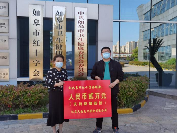 2022年5月5日,江苏天南电力股份有限公司积极践行社会责任和担当,向如皋市红十字会捐款两万元,助力疫情防控。市红十字会常务副会长康岚对企业的善举表示感谢,市红十字会将第一时间把捐款汇往如皋市疫情防控指挥部,确保捐款用在防疫一线,做到专款专用,把企业的爱心落到实处。