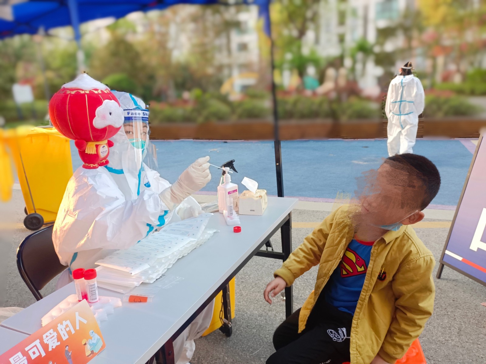 “小朋友你看,雪容融给你点赞哦!”天澄社区核酸检测点位上来了位新朋友,原来是网红吉祥物“冰墩墩”和“雪容融”。为了让哭闹的小朋友顺利配合核酸检测,天澄社区在点位上悬挂冰墩墩和雪容融等卡通玩偶,给采样现场增添了温馨和童趣。这些玩偶吸引了孩子们的注意力,安抚了小朋友们紧张的情绪,让小朋友们顺利完成采样。