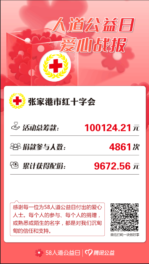 涓涓细流,汇成大海。58人道公益日圆满收官,能够在短短的一天时间里顺利完成目标,少不了每一个慷慨付出的你。感谢港城爱心人士贡献爱心力量,为有人道救助需求群体提供人道关怀,对港城红十字事业提供支持与关爱!