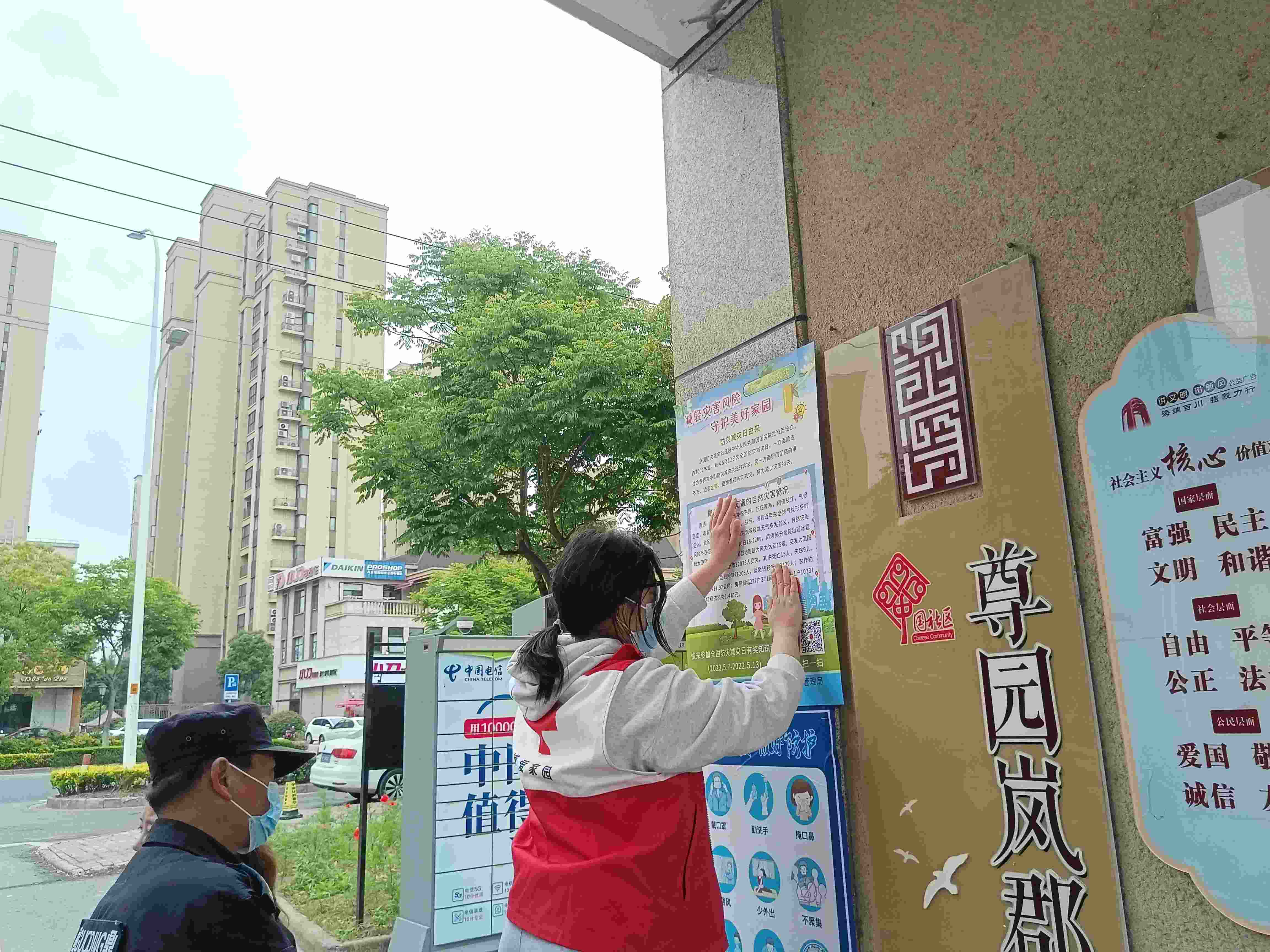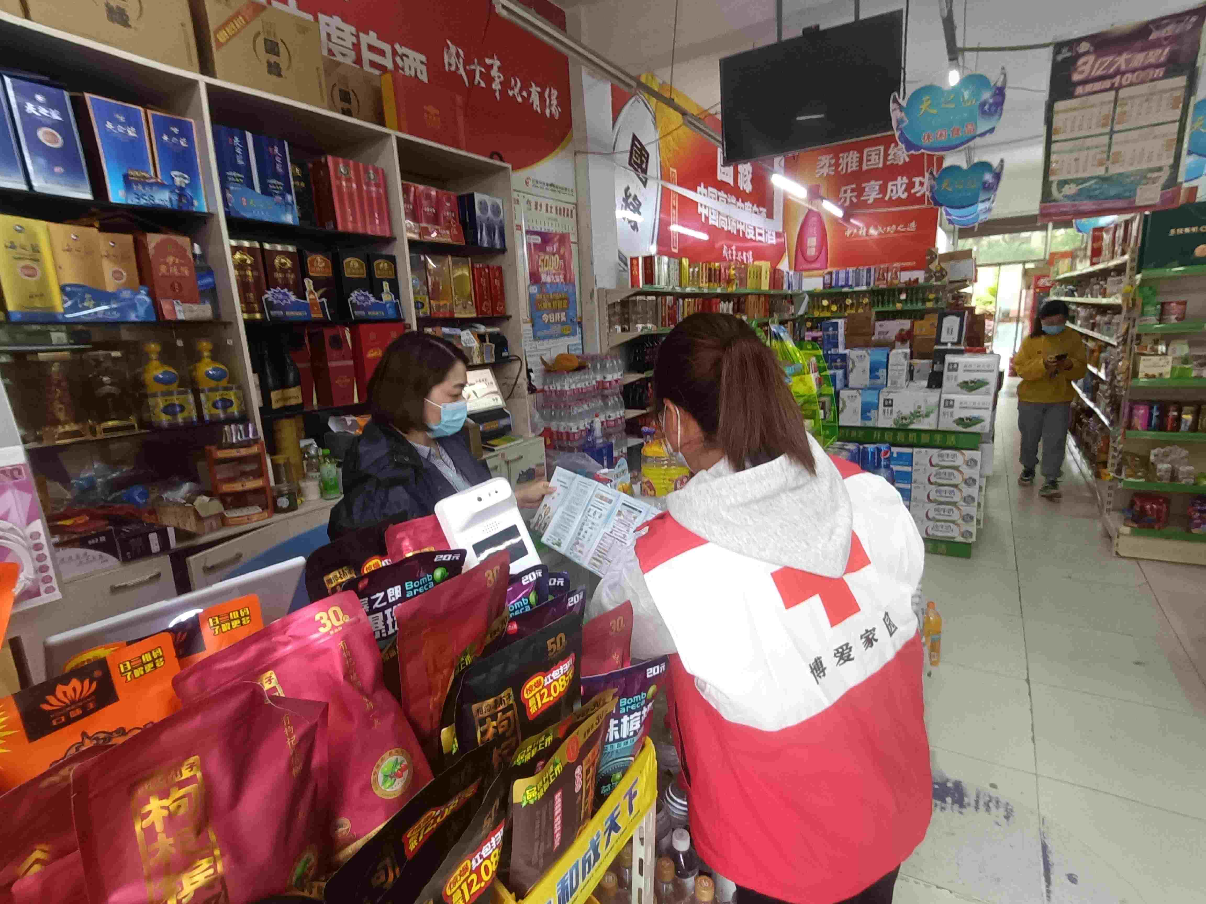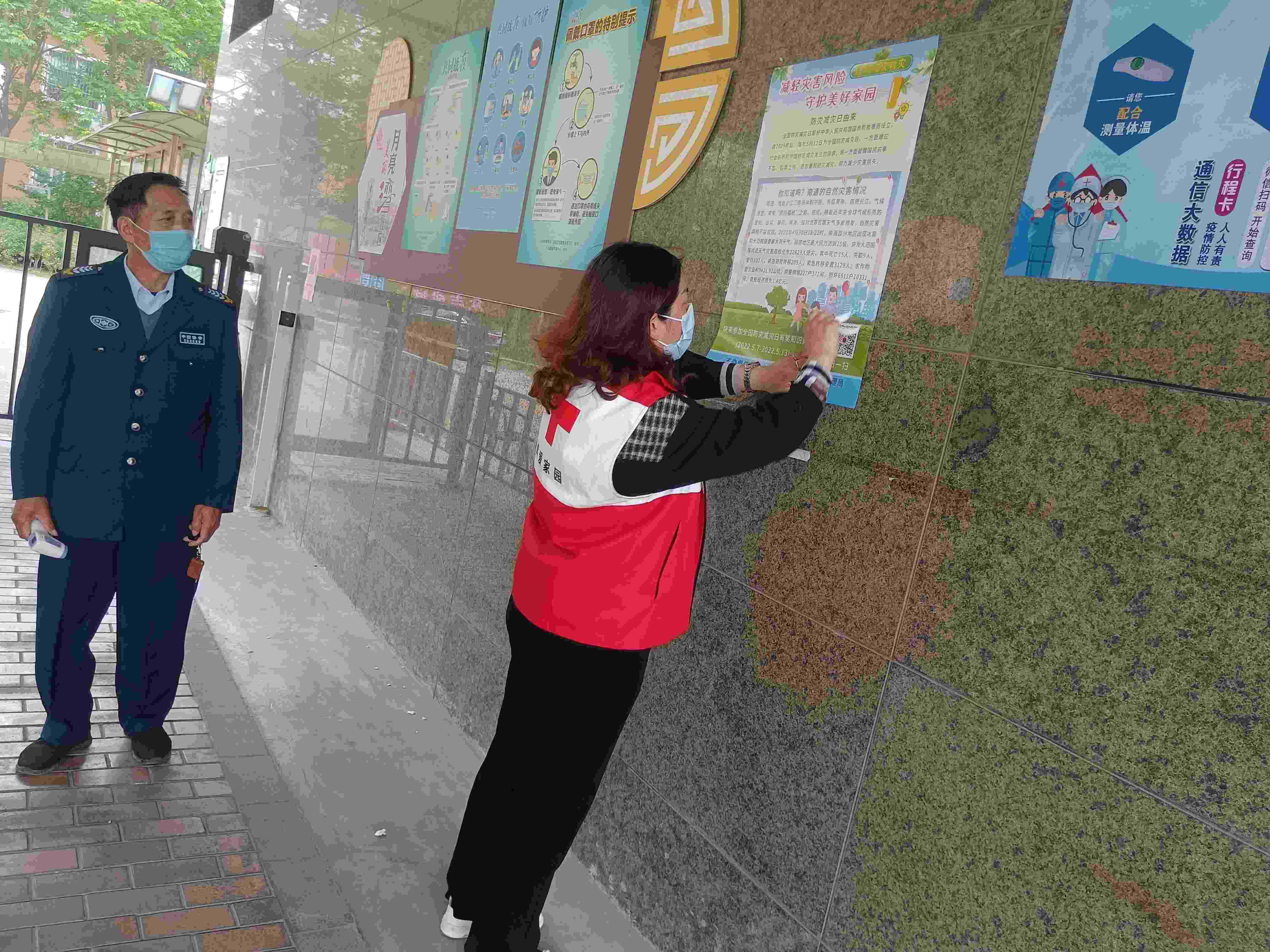 活动中,社区工作人员和红十字会志愿者在小区内发放和张贴宣传资料、悬挂横幅、有奖问答等多种宣传形式向群众传播防灾减灾及应急科普知识。