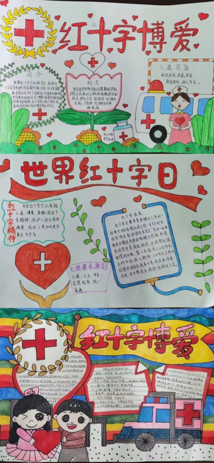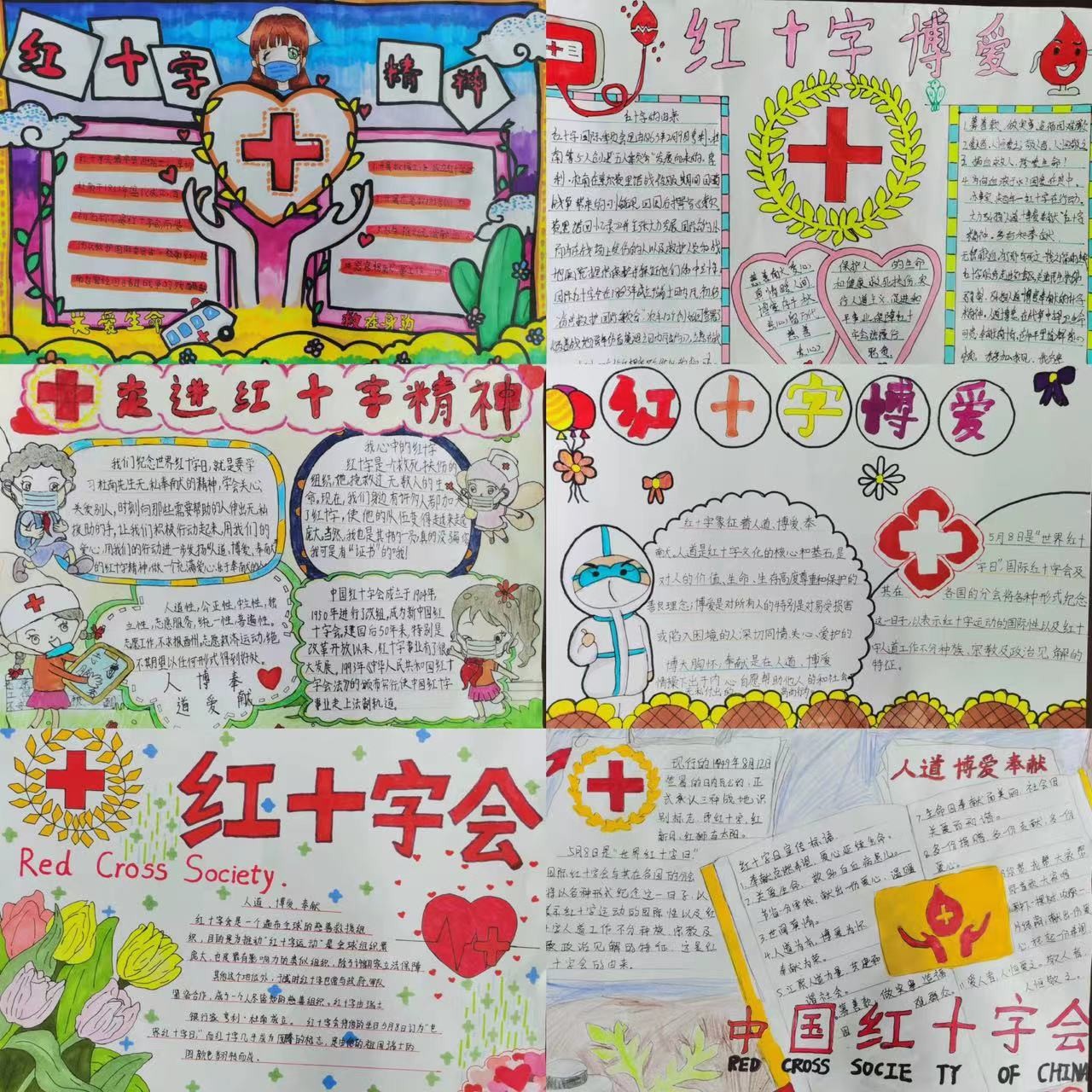 诠释“红十字”内涵。同学们用自己的智慧和巧手,制作出了一张张精美的手抄报。作品主题突出,版面设计新颖独特,图文并茂地介绍了红十字知识和红十字精神,把红十字会宗旨——保护人的生命和健康,发扬人道主义精神,促进和平进步事业,诠释得淋漓精致。
