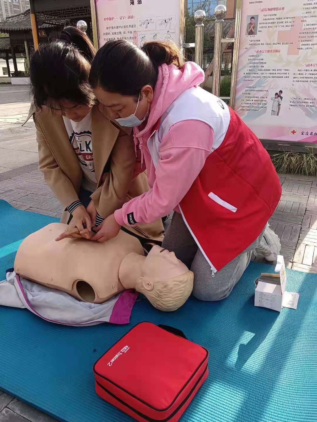 为庆祝第75个世界红十字日的到来,5月9日,宝应县安宜镇莲花社区博爱家园在城南生态公园开展应急救护知识培训。