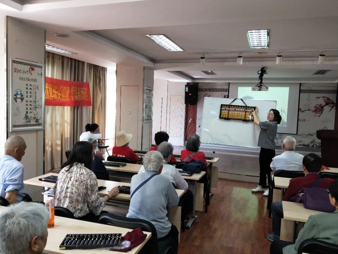 志愿者分散坐在老人中间,一对二负责指导。正式课程开始之前,巢老师先与老人一起复习了上节课内容,之后发放练习题,让老人们拨算盘练加减,算出最终答案,结果统计,80的老人都正确完成了题目。根据老人们的掌握情况,老师鼓励了满分老人,对还不熟练的老人,发动现场志愿者对其进行了个别辅导。