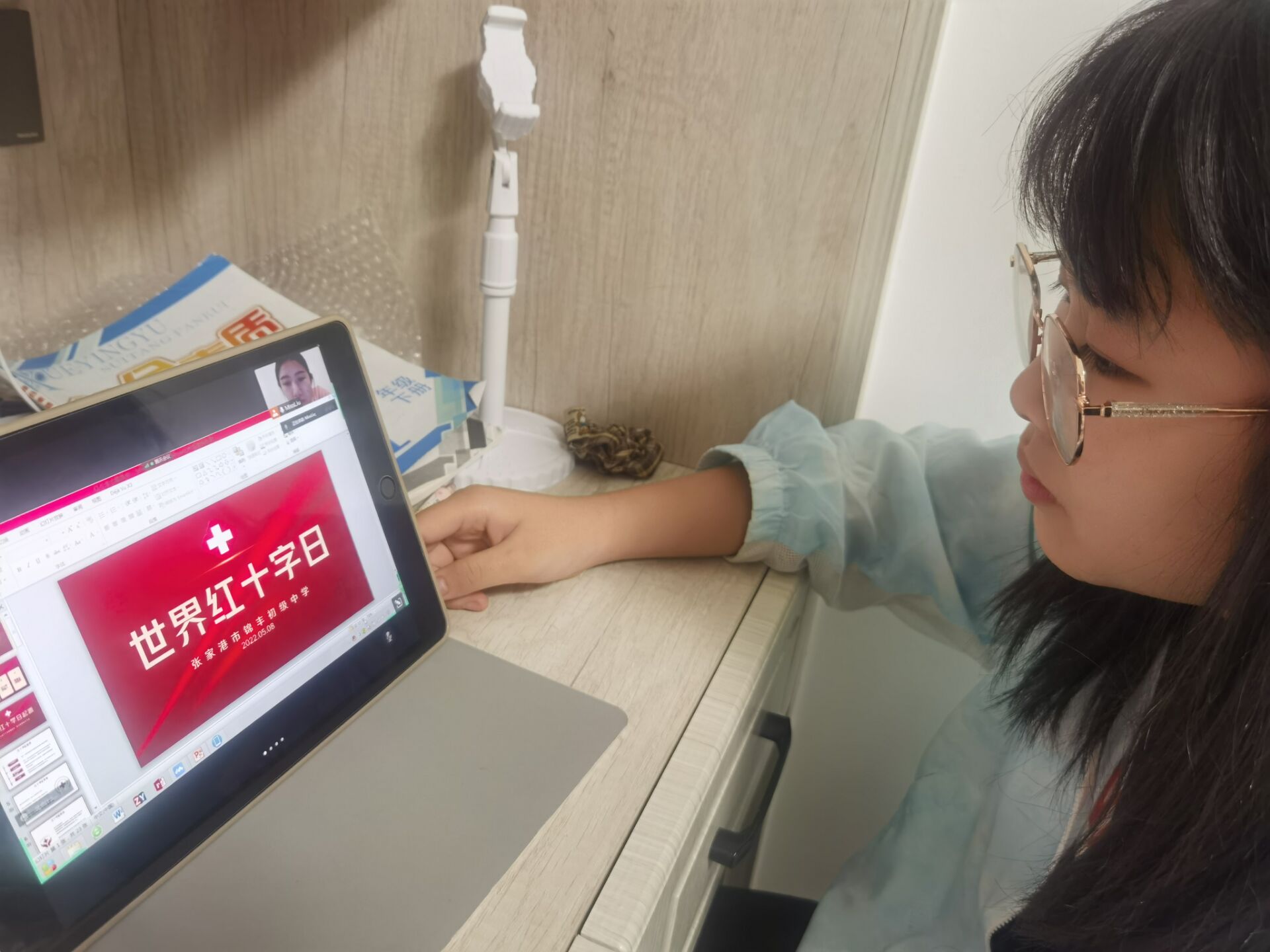 5月8日当天,学校邀请了红十字救护培训师来学校开展“心肺复苏”专题应急救护培训,将理论学习和实操训练相结合,让学生了解并掌握必要的急救技能。学校还积极动员师生参与线上“红十字生命教育防灾避险”知识竞赛活动,号召师生为“58人道公益日”筹款,引导学生成为“博学渊识、爱洒天下”的时代好少年。