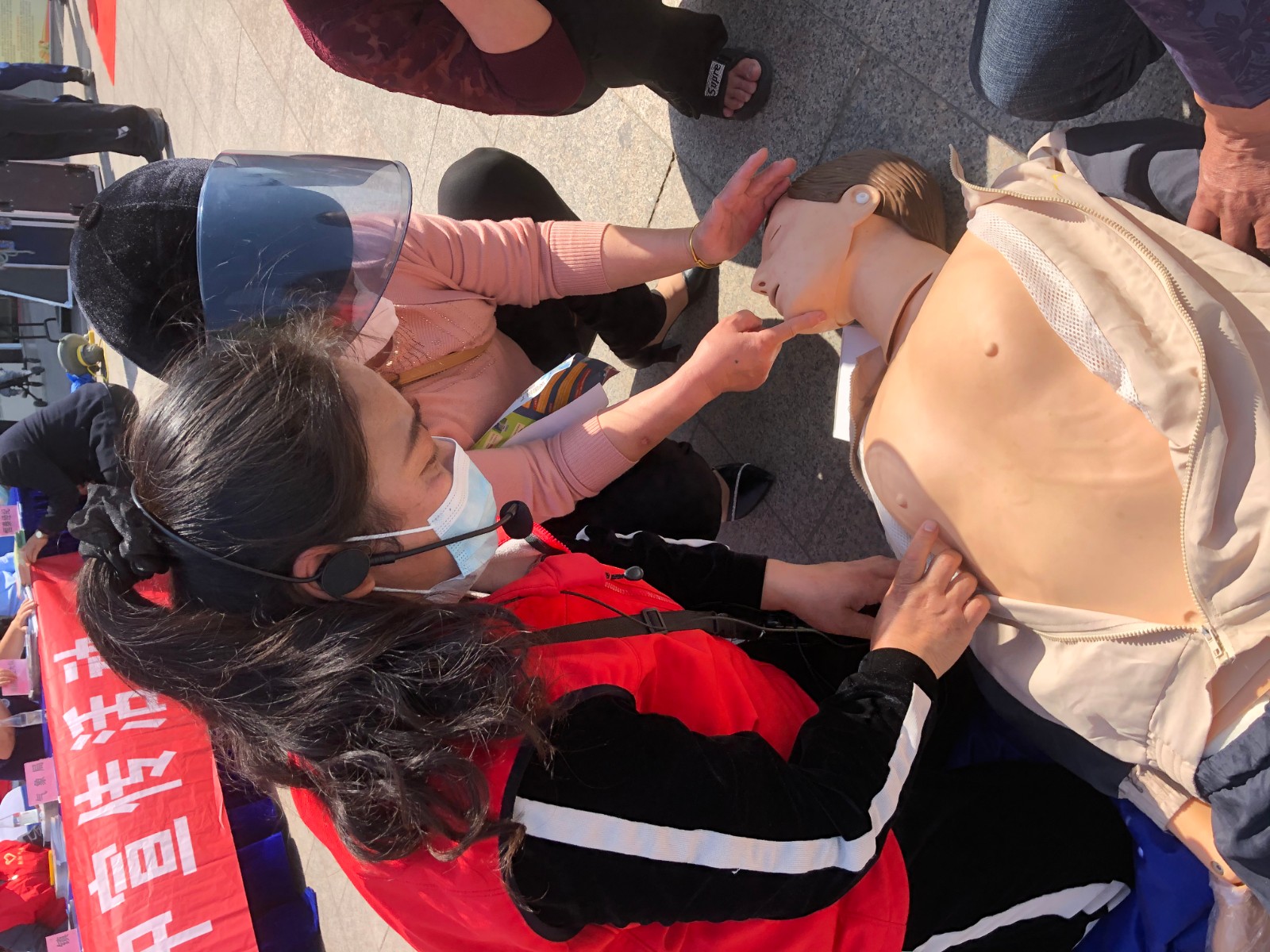 在活动现场,射阳县红十字会提供的12块健康教育展板吸引了大量群众的围观。志愿者们在严学友队长的带领下,向大家分发了一千多份家庭健康教育材料,并反复演示了心肺复苏急救技术。红十字志愿者们生动的讲解与娴熟的演示引发了周围群众的极大兴趣。大家纷纷下场操练,反复询问,学习技术要领。严学友队长告诉大家:“心搏一旦骤停,如果得不到及时的抢救复苏,4至6秒之后,就会造成患者脑和其它重要器官不可逆的损害,因此,心搏骤停后的心肺复苏必须在患者发病现场立即进行。掌握按压与吹气30:2的心肺复苏急救技术是广大人民群众在紧急情况下自救、互救的必备技能。”
