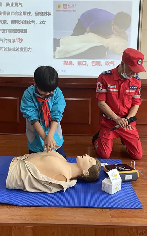“红十字博爱周”活动期间,邹实小的师生们通过线上线下相结合的方式进行了红十字救护知识培训。5月8日到5月12日期间,邹实小的师生们通过观看“常州红十字会”公众号上的网络直播,对心肺复苏、AED的使用、气道异物梗阻、止血包扎、意外伤害方面的内容有了初步的认识。5月16日,常州市钟楼区冲锋救援队钱俊老师给邹区实验小学四(1)班的学生进行了红十字救护知识培训。活动中,钱老师详细讲解了心搏骤停概念、心肺复苏操作流程及AED使用注意事项。同时钱老师还现场示范心肺复苏、人工呼吸操作流程。学生们认真听讲,仔细观摩现场示范流程,并在钱老师的指导下进行了心肺复苏练习。通过培训,邹实小的师生们掌握了初级救护的要点,提高了突发情况下自救互救能力。