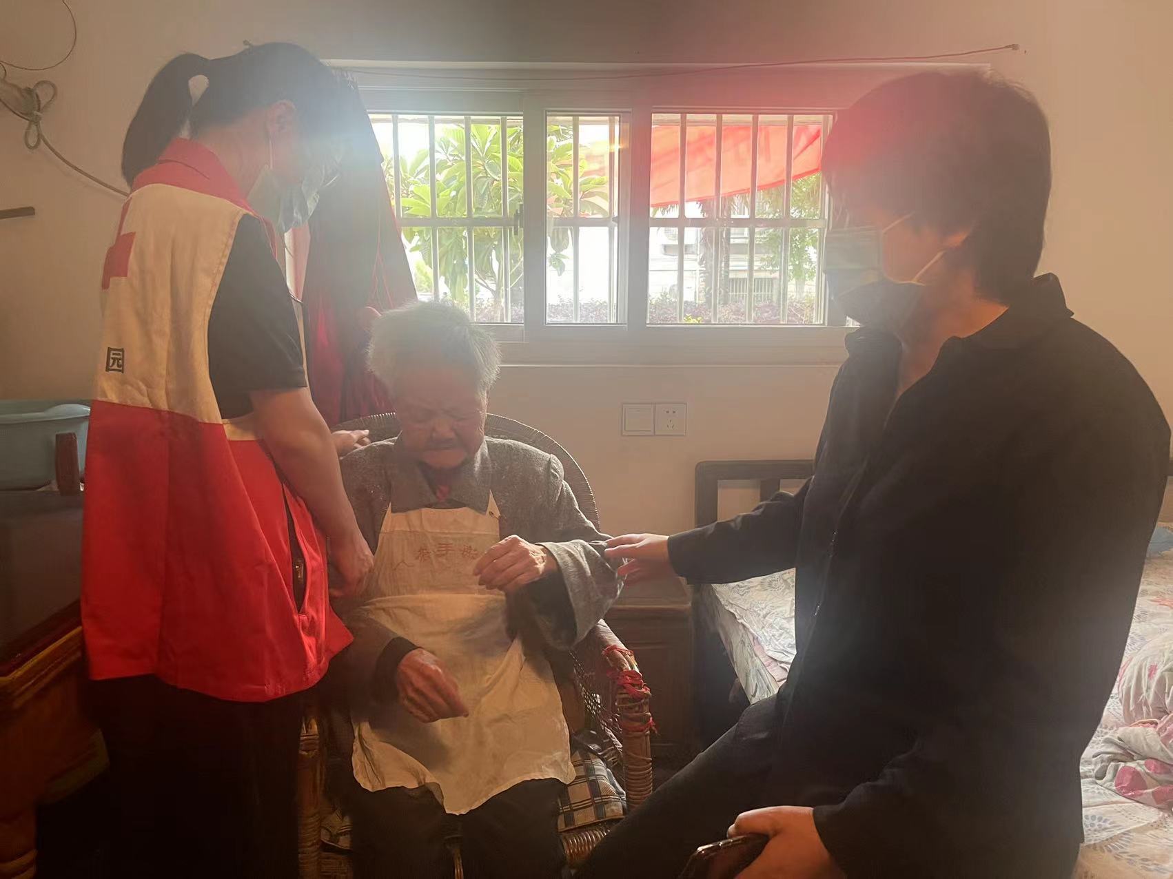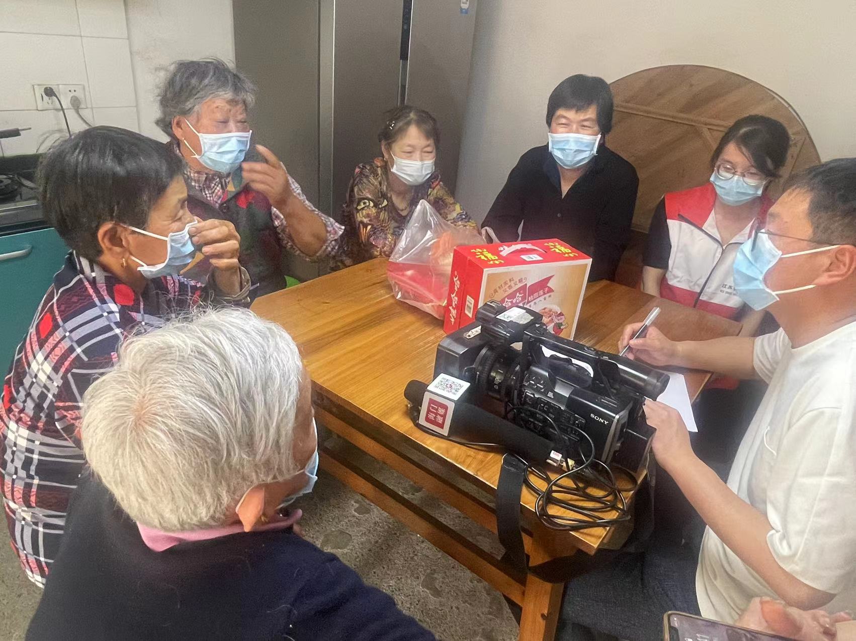 志愿者通过询问其四个儿媳妇了解陈秀珍的生活近况,志愿者为老人送上慰问品,拉着老人的手嘘寒问暖,关心她的起居饮食,叮嘱老人要注意添加衣物,保持心境开朗。