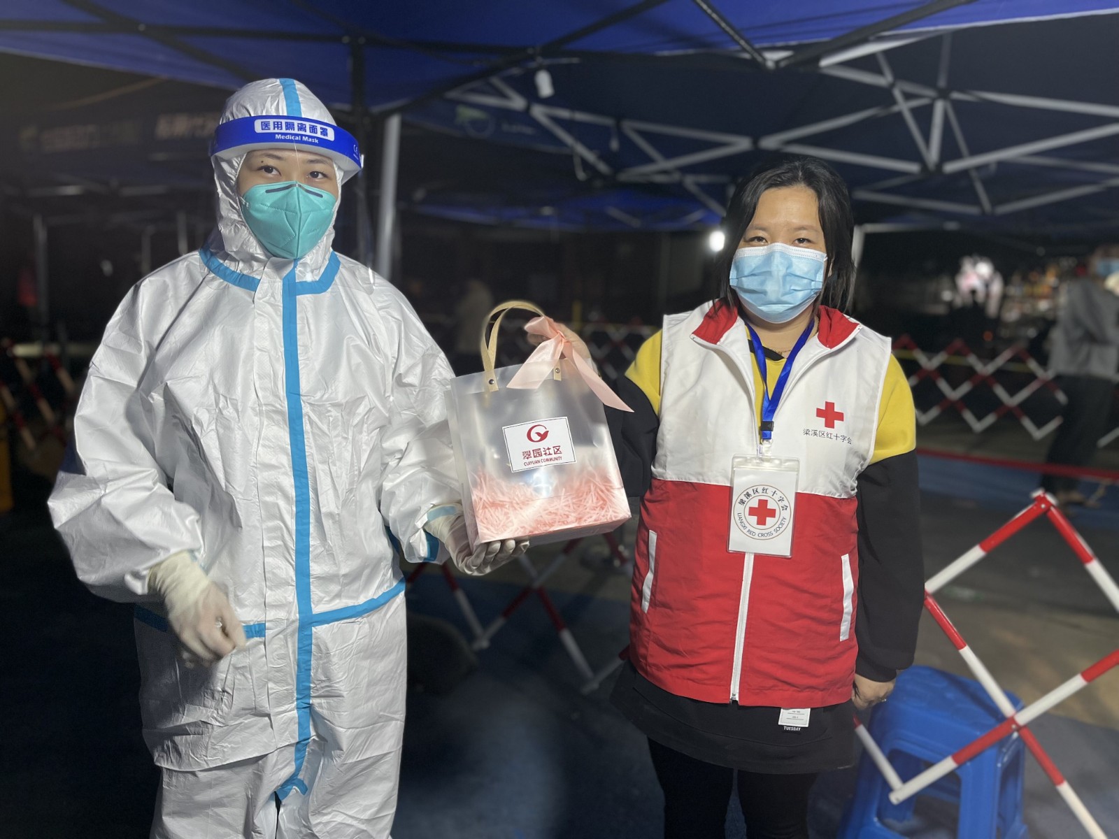翠园社区红十字会为每一位辛勤付出的“白衣天使”送上了小风扇等慰问品,今天仍奋战在核酸采样前线的八院护理部护士潘怡对我们说:“感谢社区对我们的关心,在这个特殊的日子里,受到大家的肯定,很暖心。”
