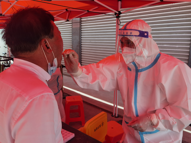 5月12日,正在学校参加核酸采集的王庆芳接到父亲突然病倒电话,王庆芳掩饰内心的不安说,没事应该不要紧,有母亲陪着,还有医院的同事。就这样她坚持完上午半天采样工作,才回到医院照顾中风的母亲。第二天在全民核酸采样点依然看见她采样的身影。