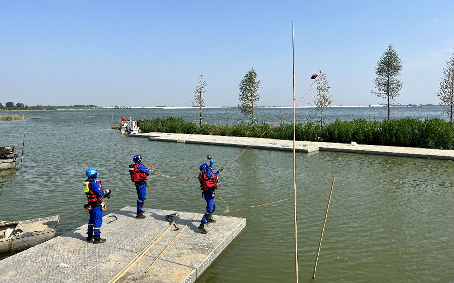 为了做好赛事保障,连云港市红十字救援队,提前进场,熟悉水域环境,加强练习各种水域救援技巧,保障熟悉赛道队伍开展训练。