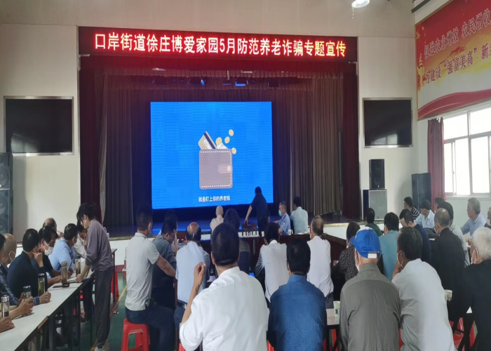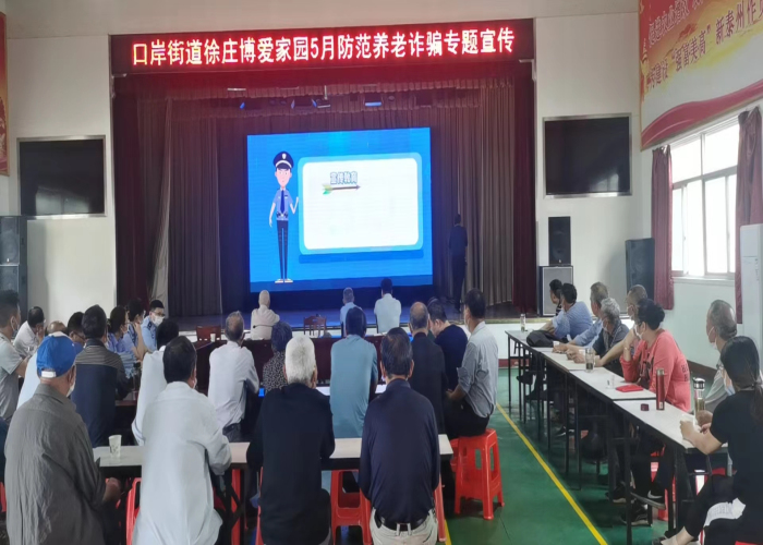 口岸街道徐庄村博爱家园5月25日下午开展5月防范养老诈骗专题宣传活动,活动期间老年人观看了警方宣传片,口岸派出所的民警同志现场为大家做了防诈骗要点,徐庄村徐书记、宗书记作了讲话提醒群众防范老年人诈骗。