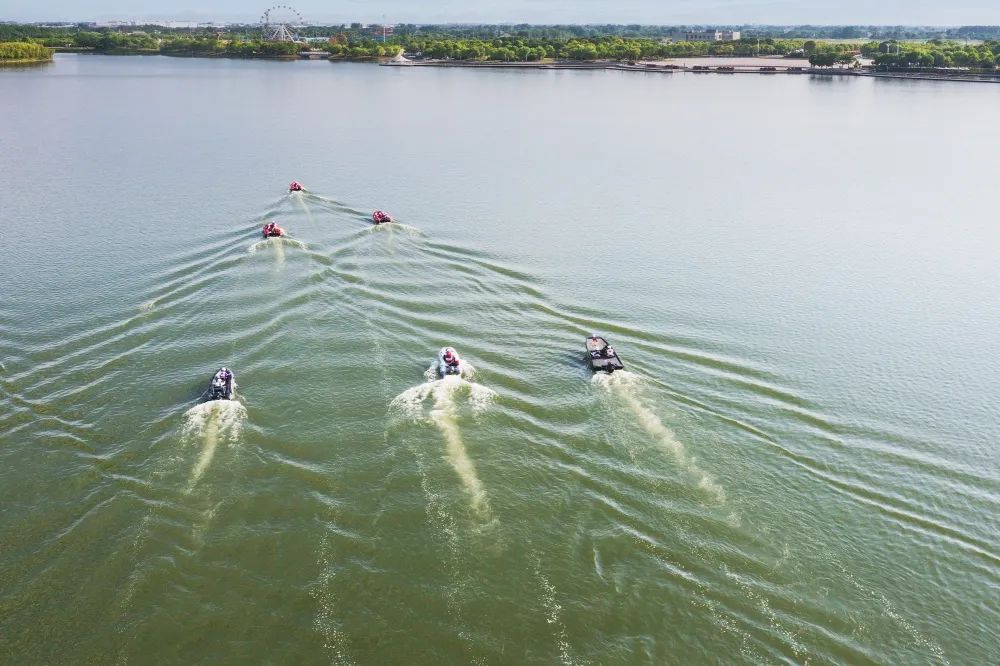 演练当日,龙游湖波光粼粼,澄澈如镜。救援船只整齐划一,停靠在岸,参训队员集结完毕,整装待发。指挥员一声令下,救援队员迅速响应,熟练驾驶救援船只,宛如入水的蛟龙,依次完成了列队、冲锋舟组队巡察、水下机器人搜救打捞、离心力救援、心肺复苏+救护车转运等演练项目。