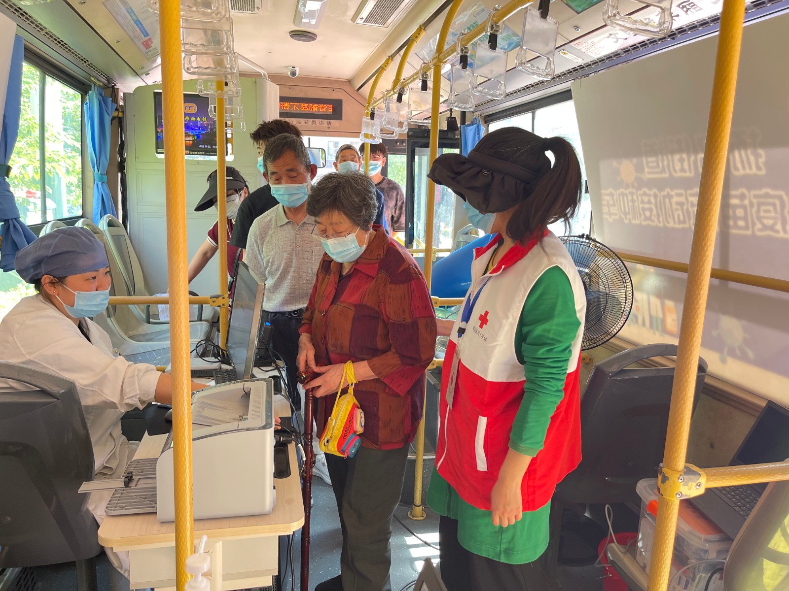滨河社区疫苗接种现场共设有等候区、接种区和留观区3个区域,每个区域都有专人引导。居民们通过刷身份证进行预检筛查,测温后进入等候区准备接种。疫苗接种车“麻雀虽小,五脏俱全”,车内配有完善的疫苗接种设备和医用物资,疫苗的冷藏储存、接种、救治保障等环节安全覆盖。居民从上车接种到下车整个流程只需短短几分钟。接种完成后在留观区观察半小时,确认无恙便可离开,真正实现了“即来即种”“散步式接种”的高效接种模式。社区红十字志愿者“人随苗动”,全力以赴协助疫苗接种工作。在红十字志愿者和医护人员的组织引导下,居民们有序进行预检、登记、接种、留观。