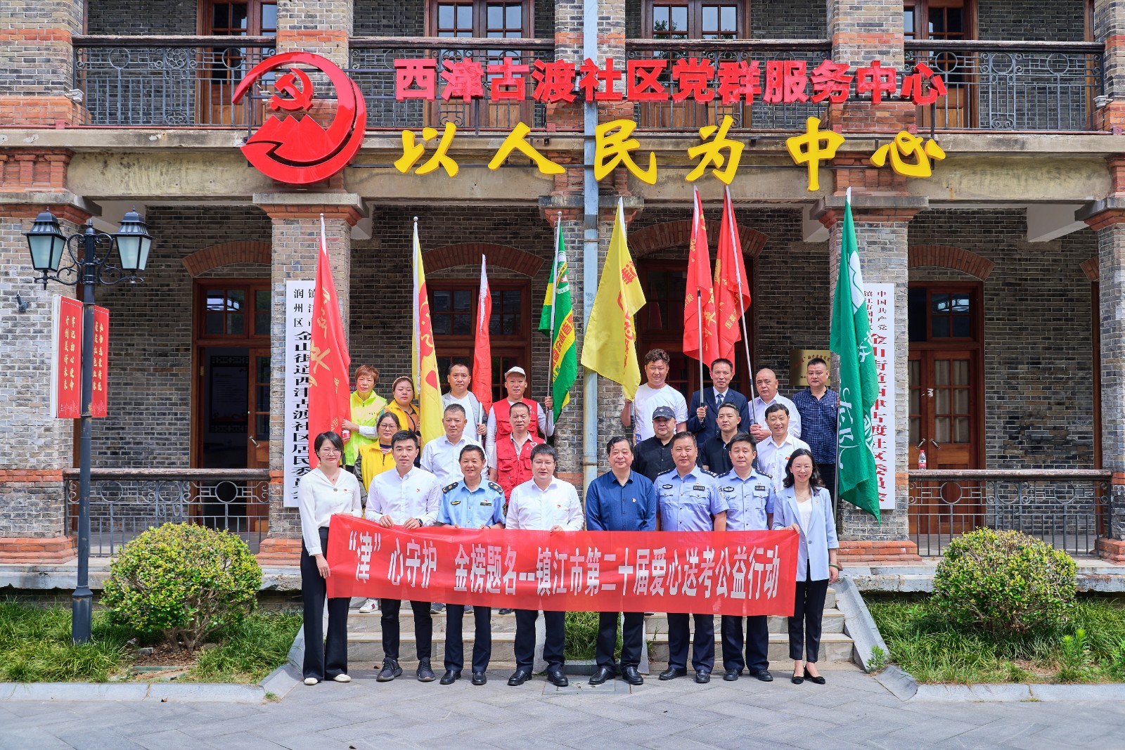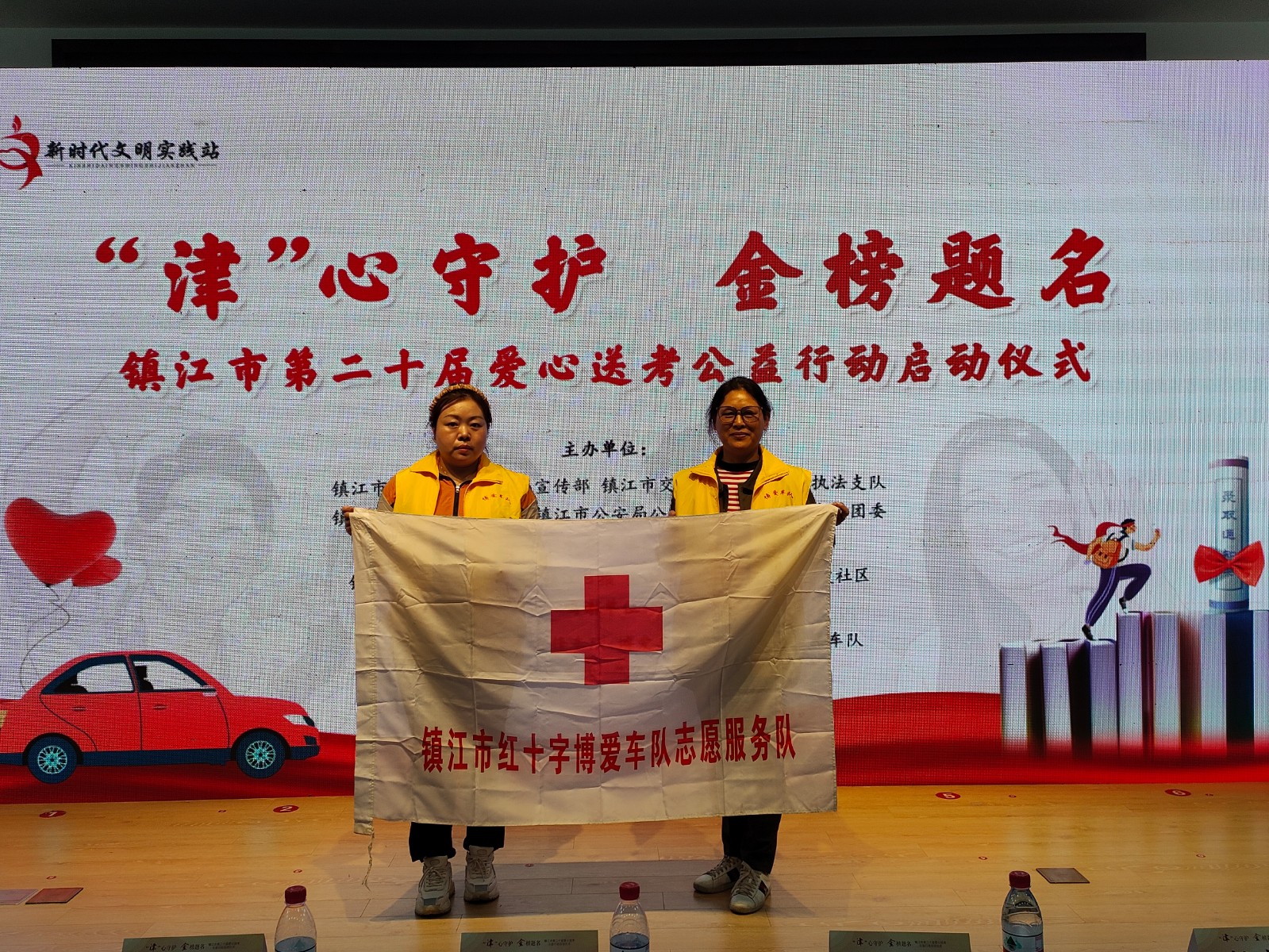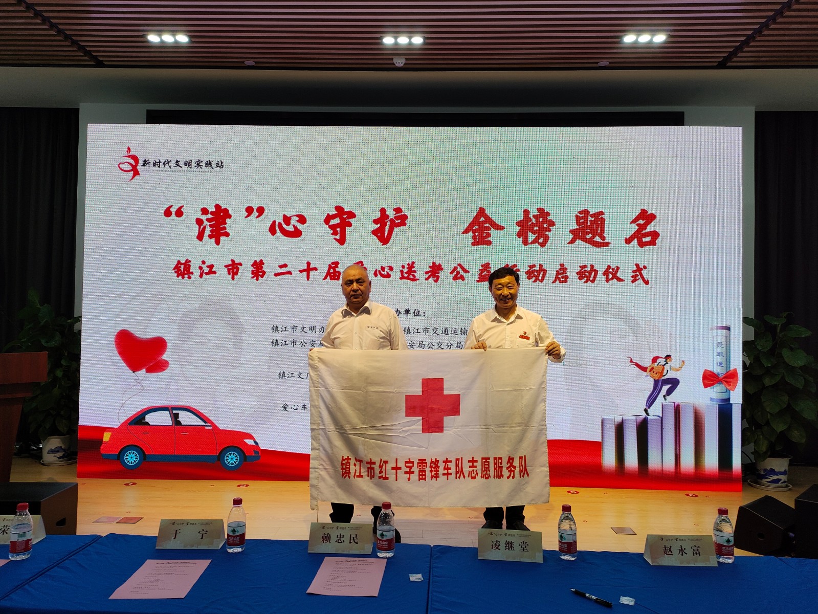 镇江市第二十届爱心送考公益行动启动仪式,2022年5月27日上午9时30分在金山街道西津古渡社区举行,来自镇江市文明办、润州区委宣传部、镇江市交通运输综合行政执法支队、镇江市公安局交警支队、镇江市公安局公交分局、镇江市教育局团委、金山街道党工委、西津古渡社区的领导出席了启动仪式。来自镇江红十字雷锋车队、红十字真情车队、红十字博爱车队、红十字爱心车队、红十字温馨车队等我市八支参加爱心送考公益车队的代表、学生家长代表以及来自镇江市文广集团民生频道、镇江日报等媒体也参加了启动仪式。镇江红十字雷锋车队队长朱启明代表全市参加送考司机做承诺发言:我们全体司机一定会传承爱心、做好准备,尽责服务,完成任务!并预祝参加高考的孩子们超水平发挥,取得好成绩!