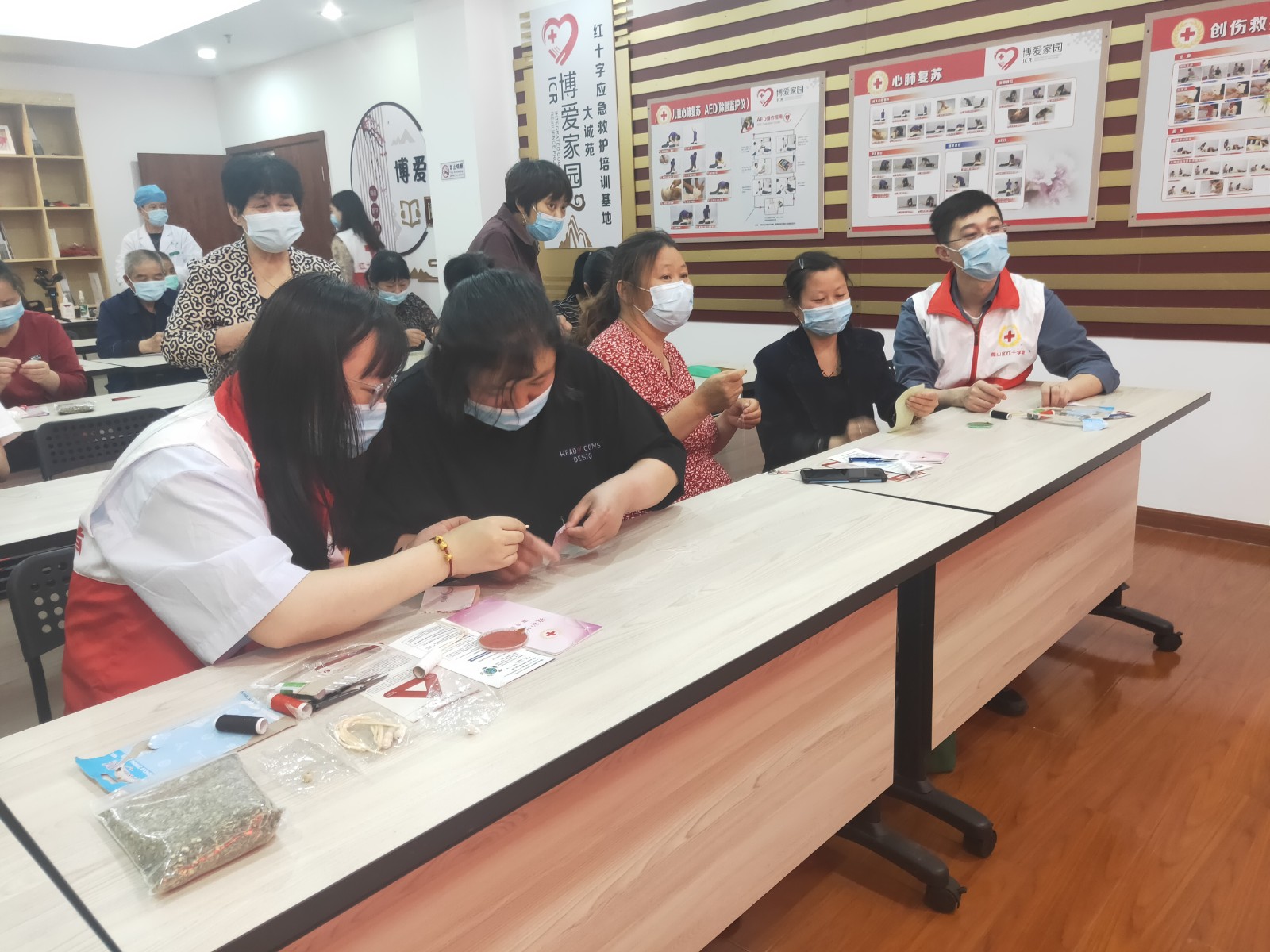 专场活动内容是缝制艾草香囊,自然环保又可驱蚊,深受老人们喜欢。活动开始后,博爱家园志愿者讲解了端午佳节的传统习俗,介绍了做香囊的材料、制作方法以及香囊的功效。在志愿者的示范帮助下,爷爷奶奶们纷纷动起手来——穿针引线、缝制香囊小口袋,最后将艾草与棉花包装进口袋里,再缝合起来,香囊的雏形就出来了,缝上挂绳,点缀上流苏,一只散发着艾草清香的香囊就做好了。老人们边做边交流心得,互相指导,展示自己的劳动成果。