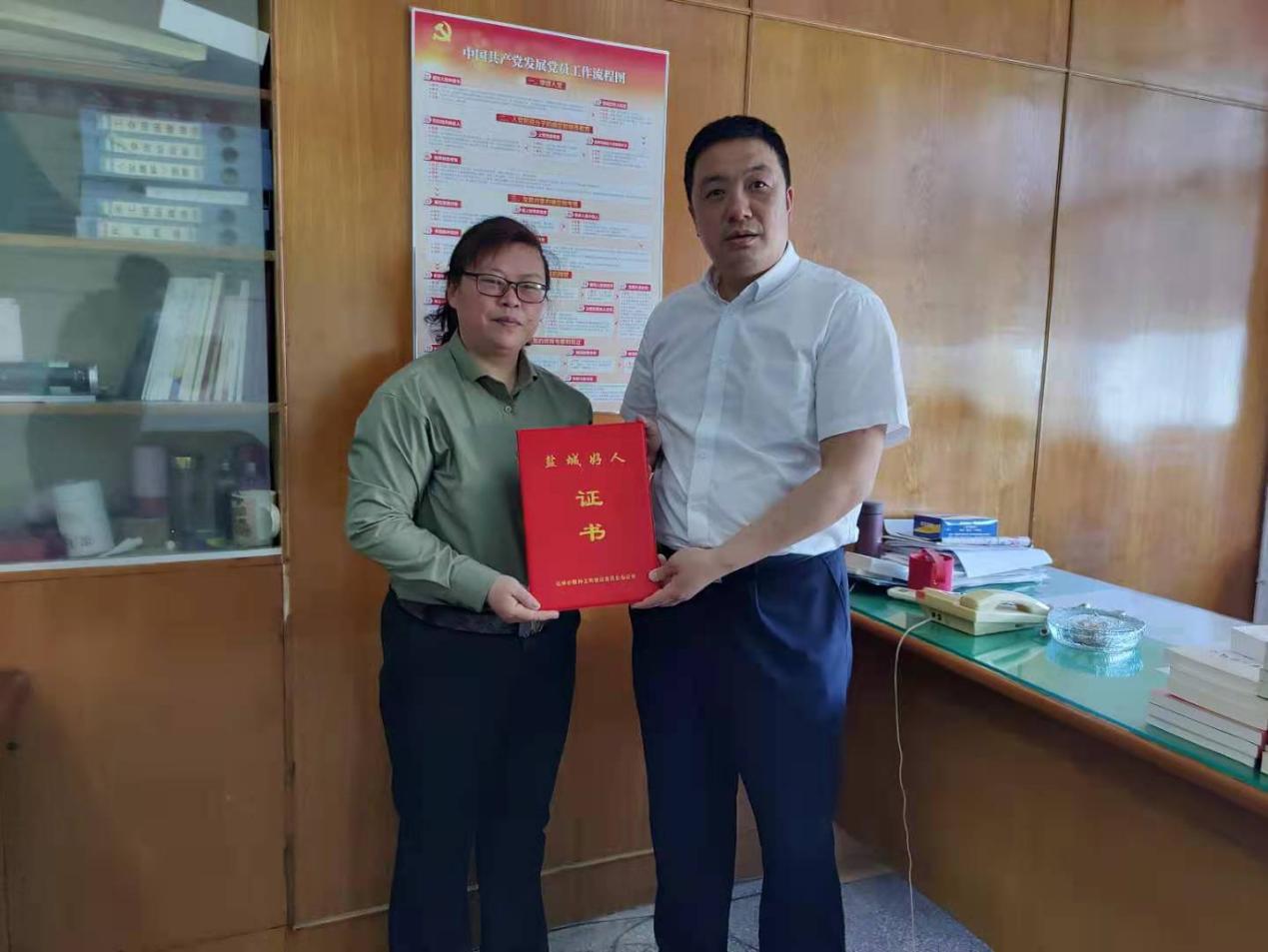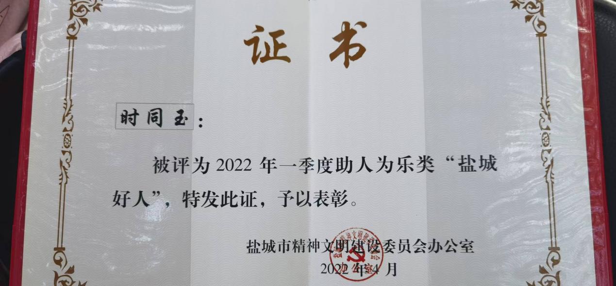 5月30日,盐城市红十字会工作人员和市红十字救援队队长走访已经离世的时同玉家人,向家人颁发了市文明办追授的“盐城好人”证书。