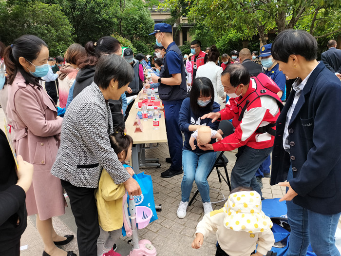 活动现场,10家单位工作人员通过摆放宣传展板,发放宣传资料、小礼品,解答居民提出的问题等方式,向大家普及安全生产、火灾、自然灾害预防及处置等防灾减灾方面的科学知识和政策法规。江苏省“五星级应急救护师”徐茂林及南京市应急救护主任导师史梅兰,为现场居民细心讲解心肺复苏、自动体外除颤仪AED的使用及创伤救护的实践操作,引来群众阵阵掌声。