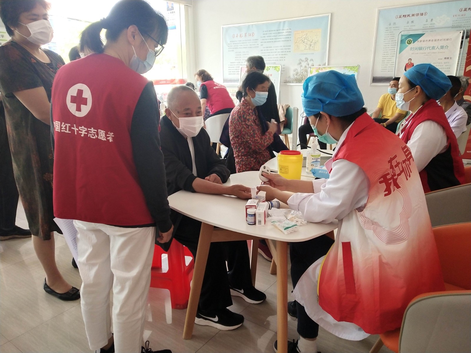 活动当天,在晨阳社区一楼大厅内,计生特扶对象有序的排队测血糖、量血压,社区医生们询问病史,给他们讲解高血压、高血糖的预防措施、注意事项。