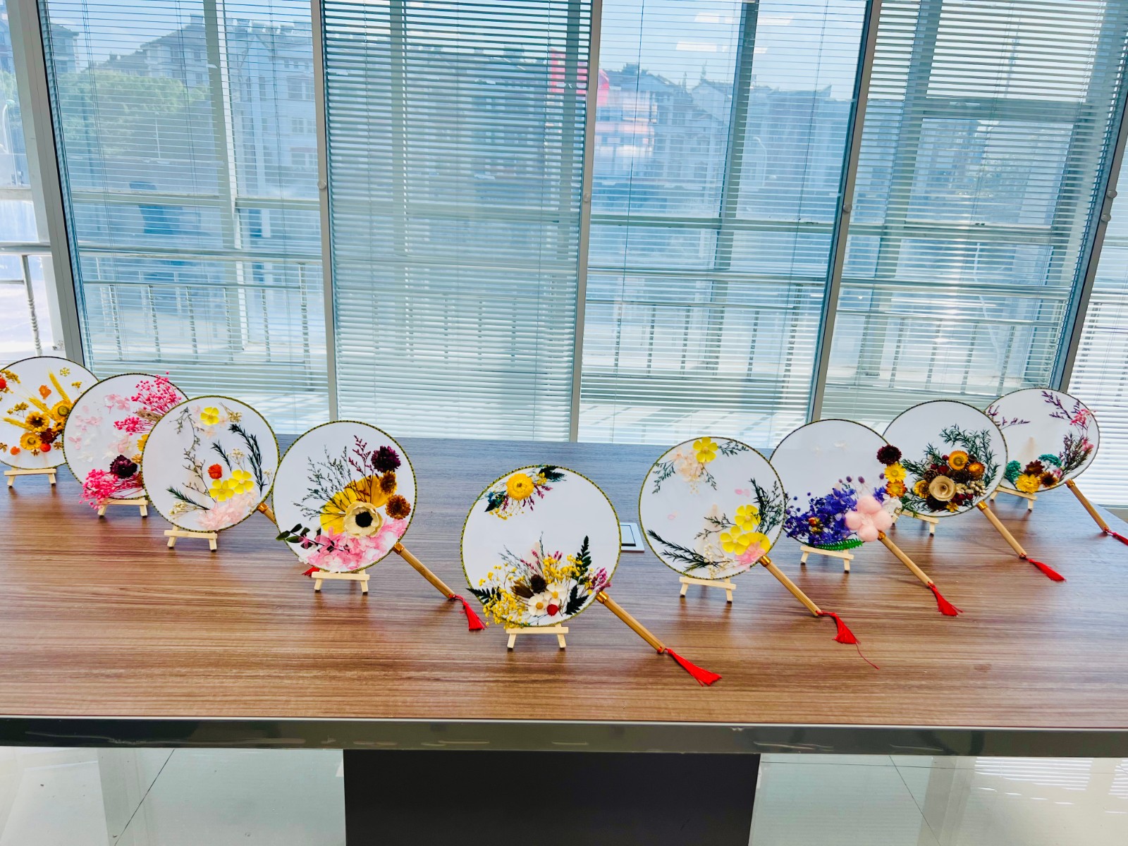 当计生特扶对象看到志愿者做的团扇样品,或清新淡雅,或浓烈艳丽,真好看。大家跃跃欲试,他们根据各自的喜好选择了一些永生花和装饰,摆好样式,认真地黏贴,边做手工,边交谈,不一会儿,一幅幅精美的扇面制作完成了,他们互相拍照留念,每个人的脸上都洋溢着笑容。