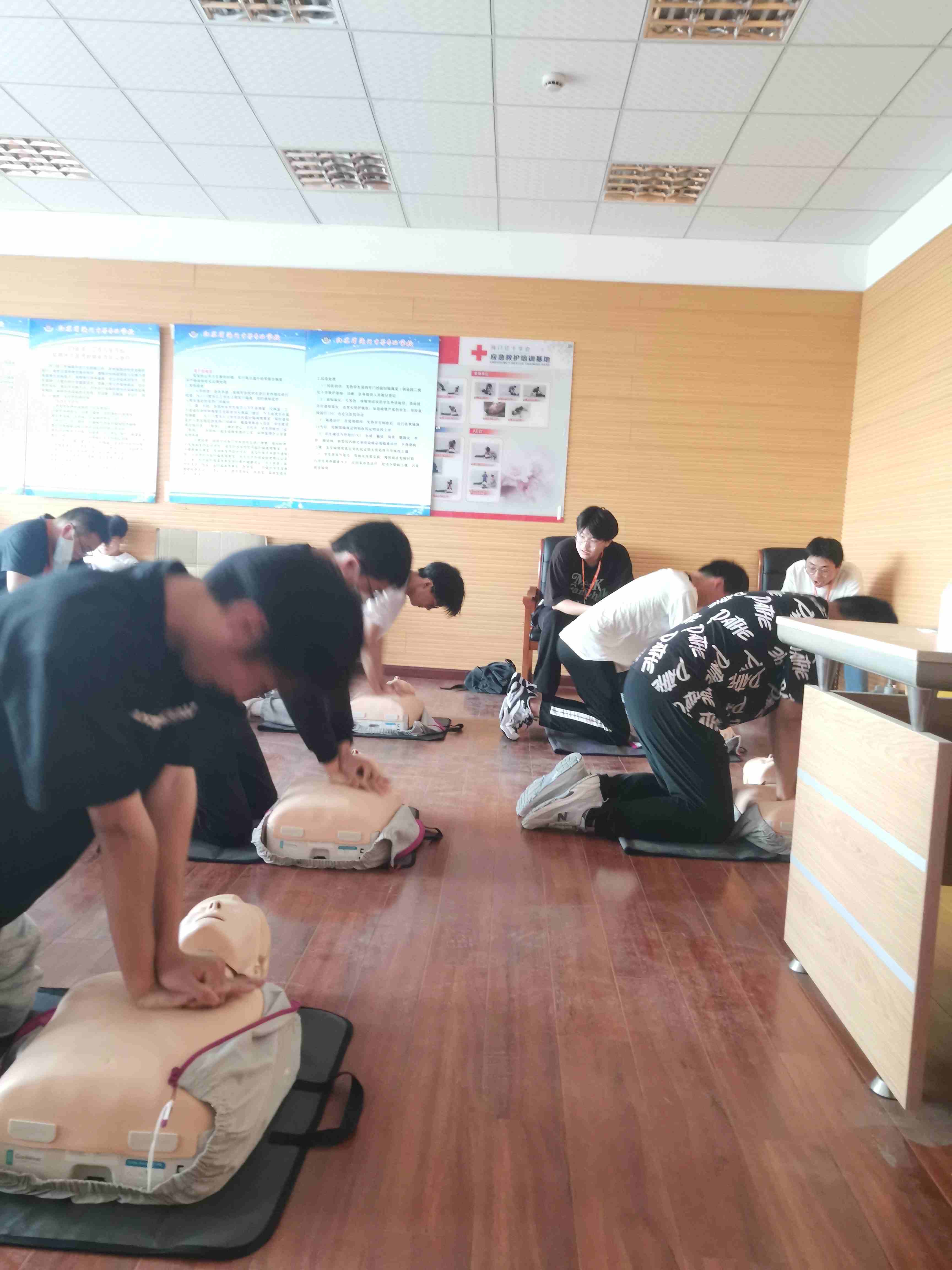 培训分为急救理论讲解、急救技能演示、理论考试和实操考核等环节。红十字会救护培训老师为大家讲解了救护环境的评估,心肺复苏的概念、目的、胸外按压、开放气道、清理口鼻异物、口对口人工呼吸等心肺复苏知识和操作要点。教学过程结束后,学员们亲身实践,利用模拟人进行心肺复苏的实际操作,将理论知识与实践操作相结合,规范操作,巩固所学,熟练掌握了心肺复苏的基本技巧。