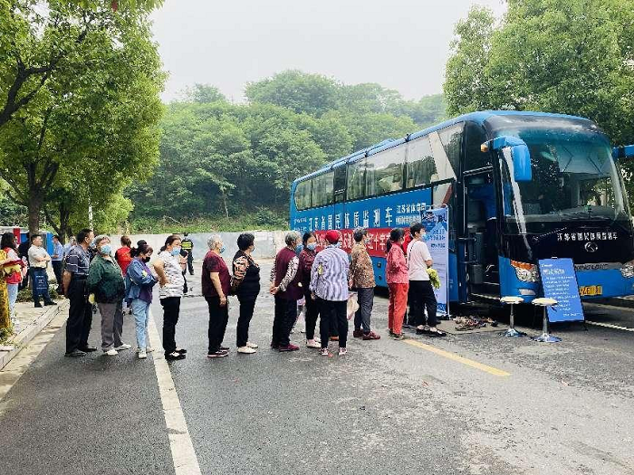5月28日上午,位于栖霞区燕子矶街道柳塘社区的熙景福苑小区门口,一辆印有“江苏省国民体质监测车”字样的蓝色大巴车门前排起了长队。刚刚监测完的顾阿姨高兴地告诉记者:“我刚上去测过了,用了十分钟不到,还给我发了一份纸质的报告,连以后怎么锻炼的建议都有,可好了!”