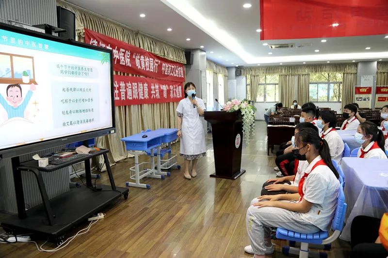 活动中,镇江市中医院眼科医生彭晓莉由端午节的传统习俗引出活动主题,向同学们讲述了艾草的神奇力量、端午节的起居饮食调配等养生智慧等,教授同学们保护视力健康常识,现场传授了耳穴压豆等简单的中医药护眼小妙招等,期间还播放了端午养生和保护视力主题课视频,博得现场热烈的掌声。