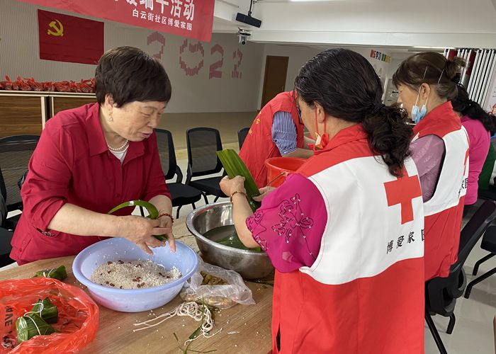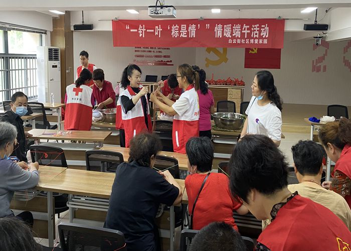 绿粽飘香,又是一年端午节,为弘扬中华民族传统文化,增强社区温馨感和凝聚力,近日,丹阳市白云街社区红十字博爱家园组织工作人员、志愿者开展“一针一叶粽是情”情暖端午活动,与社区18位老年人和15位残疾人一起包粽子送祝福,将包好的粽子煮熟了送到社区高龄长者手中,为他们送上衷心祝福。