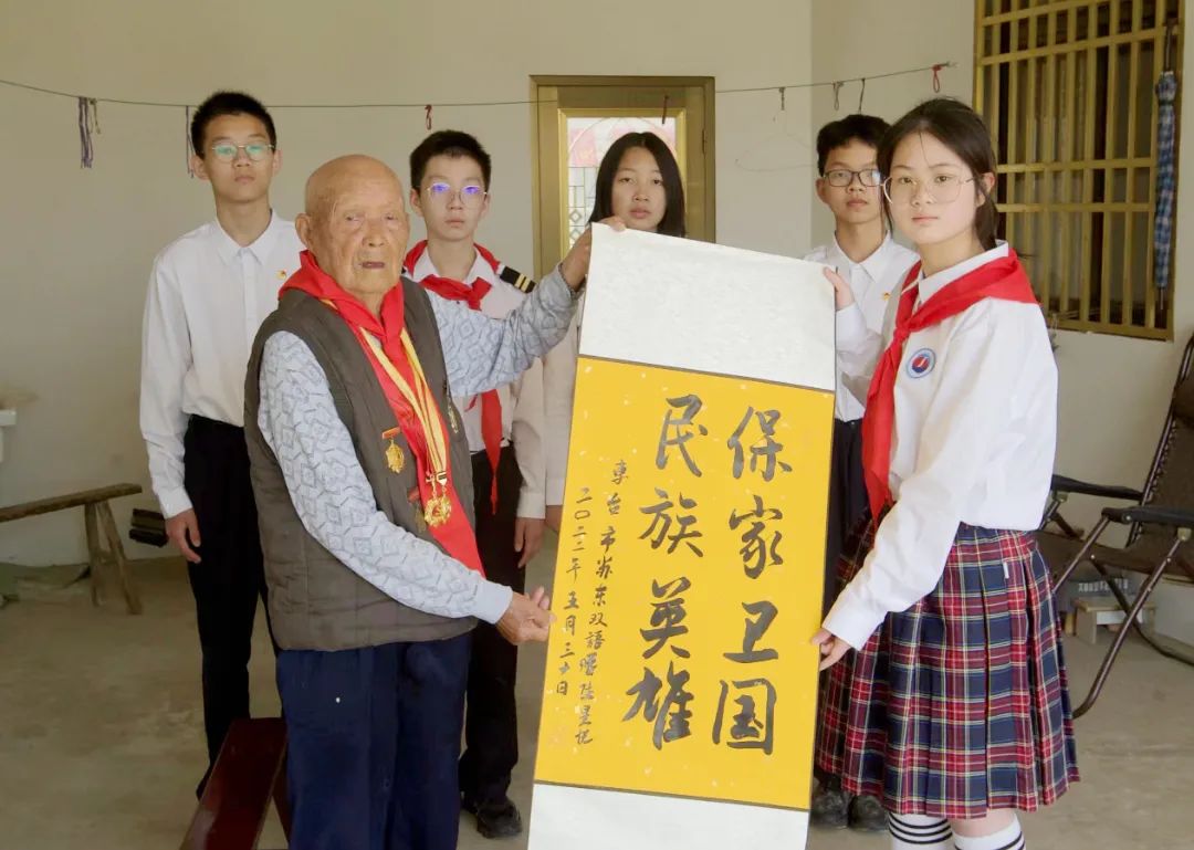 少先队员代表为老英雄周宏林佩戴红领巾,并向其敬队礼。将队员们亲手制作的粽子、香囊以及学校少工委准备的慰问品赠送给老英雄。少先队员代表陆星悦将自己的书法作品“保家卫国,民族英雄”送给了老英雄。寄予了对民族英雄爱国情怀崇高的敬意。