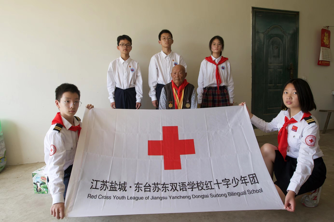 中华民族是崇尚英雄、成就英雄、英雄辈出的民族。在东台就有这样一位建国前老党员。在抗日战争、解放战争和抗美援朝时期参加过多次战争,并多次荣获奖章的战斗老英雄周宏林。端午节前东台苏东双语学校少工委、红十字少年团为了让孩子们过一个更有意义的端午节,辅导员老师带领团员和红十字少年团的少先队员代表前去探望老英雄。