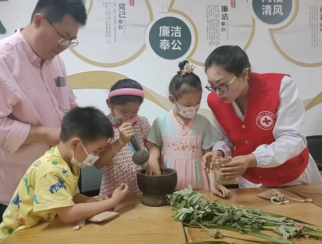 6月3日端午节当天,红十字中医院红十字养老照护志愿者服务队走进金墩社区,针推科主任王立新为社区亲子课堂送上了精彩的中医药文化宣讲课。 学习端午养生知识,纠正不良生活习惯;认识眼部穴位,学会护眼妙招;辨识常见药草、动手制作端午香囊……