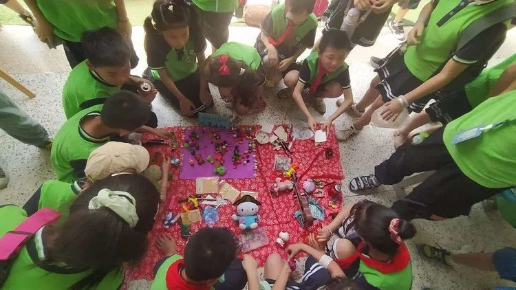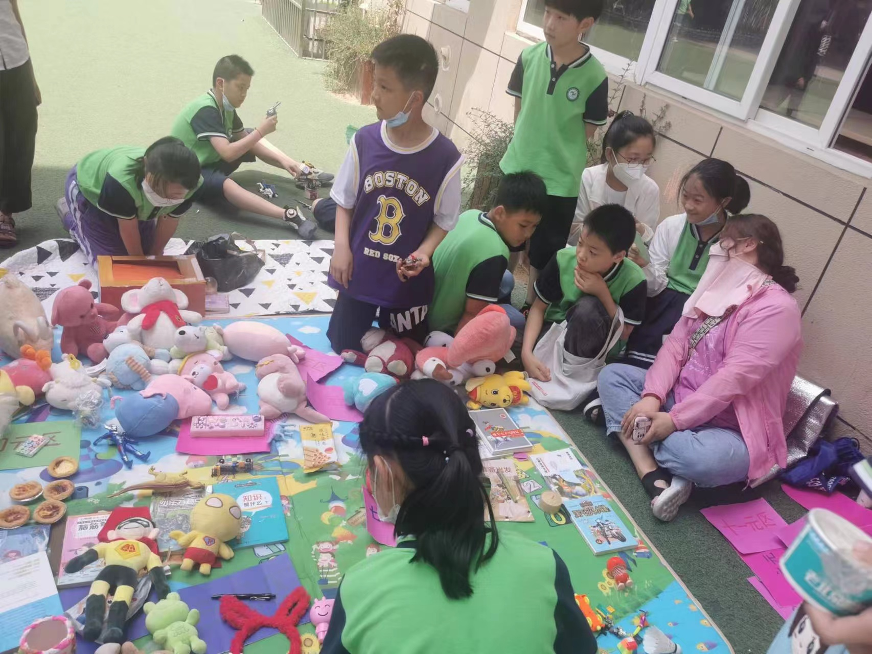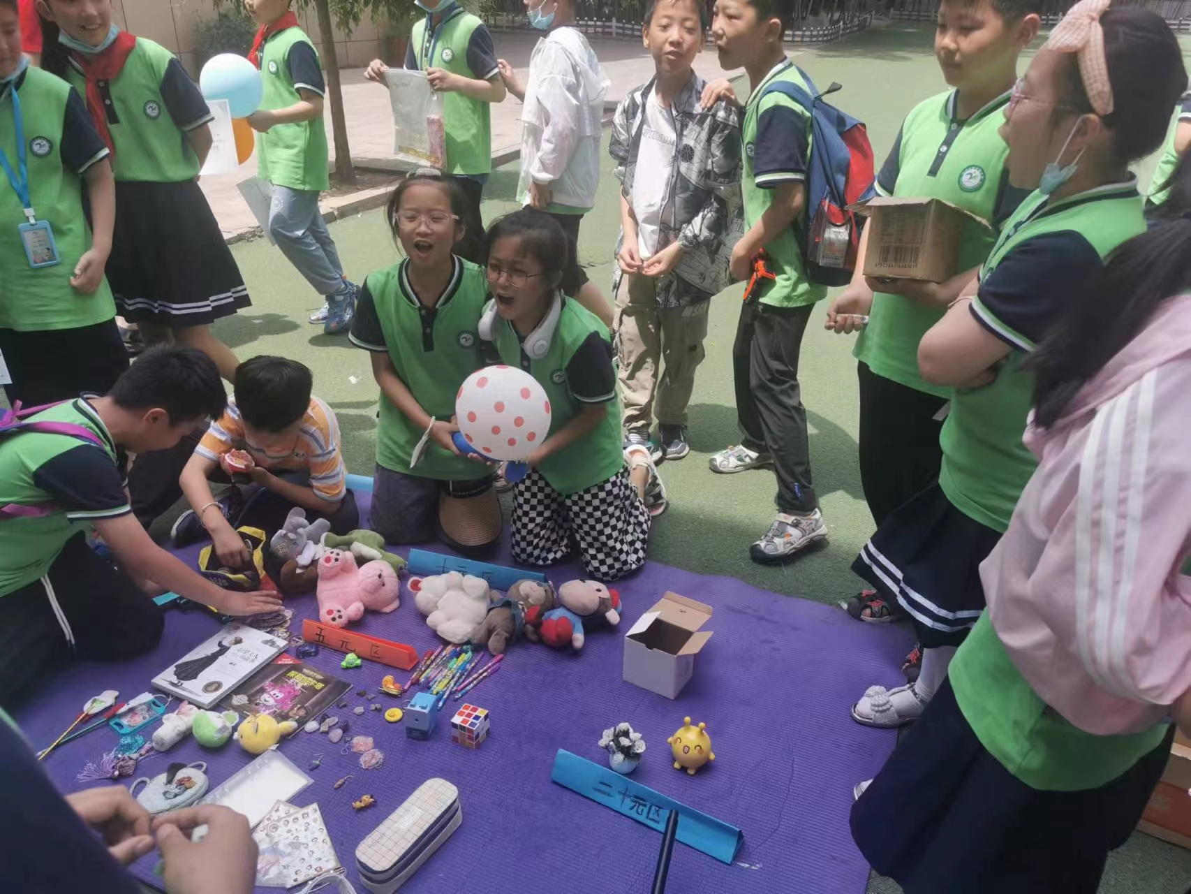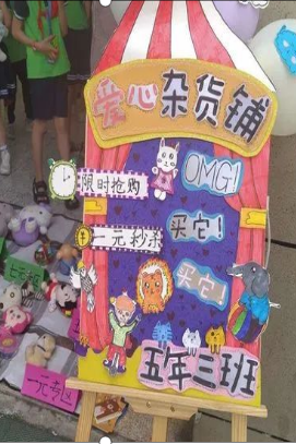 瞧瞧各个摊位,都设置了促销叫卖员、收款员,各种叫卖用的举牌道具一应俱全,各种各样的宣传口号和促销手段都颇具创意。“走过路过不要错过”“打折啦”“买一送一啦”……叫卖声、讨价还价声、欢笑声此起彼伏,场面尤为热闹。摊位上的商品也是琳琅满目,有图书、文具、玩具、工艺品、小甜点等,每个摊位都摆得满满当当,件件物品都承载着孩子们浓浓的爱意。