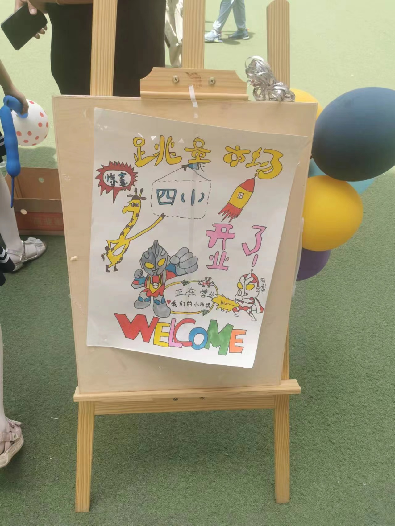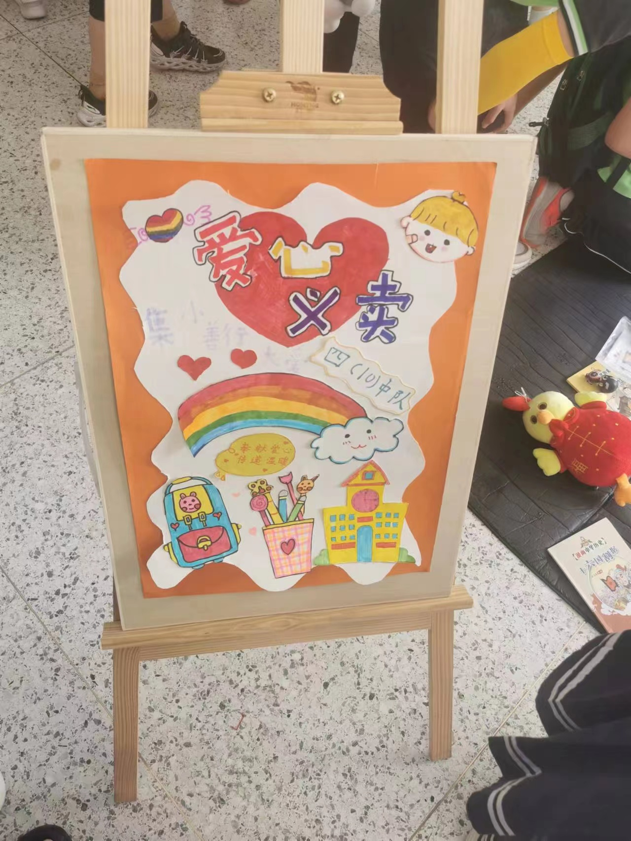 活动前两天,热心的孩子们便早已在家里整理好义卖商品,想好独具匠心的店名,精心制作了义卖海报。活动开始啦!孩子们有的搬桌子,有的架海报,有的摆商品,各个忙得不亦乐乎又有条不紊,操场立刻变身成一座熙熙攘攘的爱心集市。