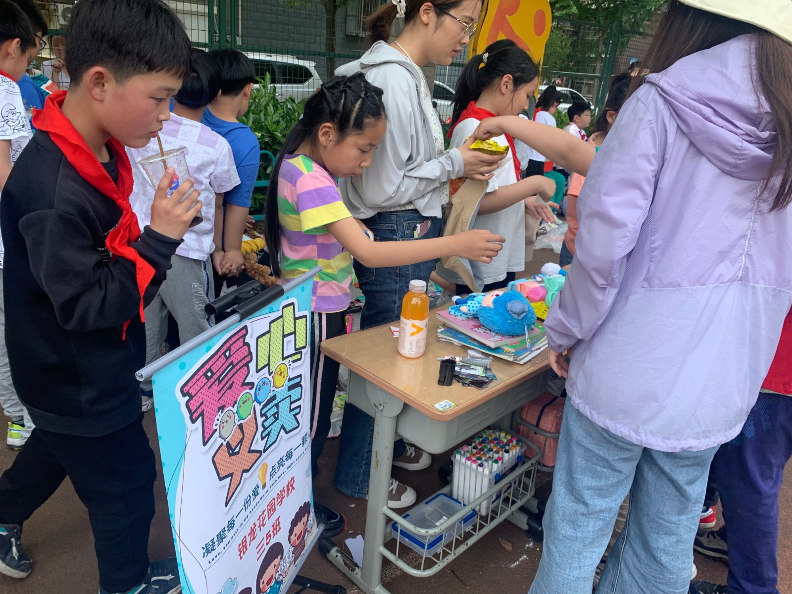 小摊主们为招揽顾客使出十八般武艺。看,有的小摊主开启“直播带货”模式,现场热烈的氛围,让老师们也忍不住出手了,淘一淘自己喜欢的小物件,买下小朋友们精心准备的“商品”,献上一份爱心。