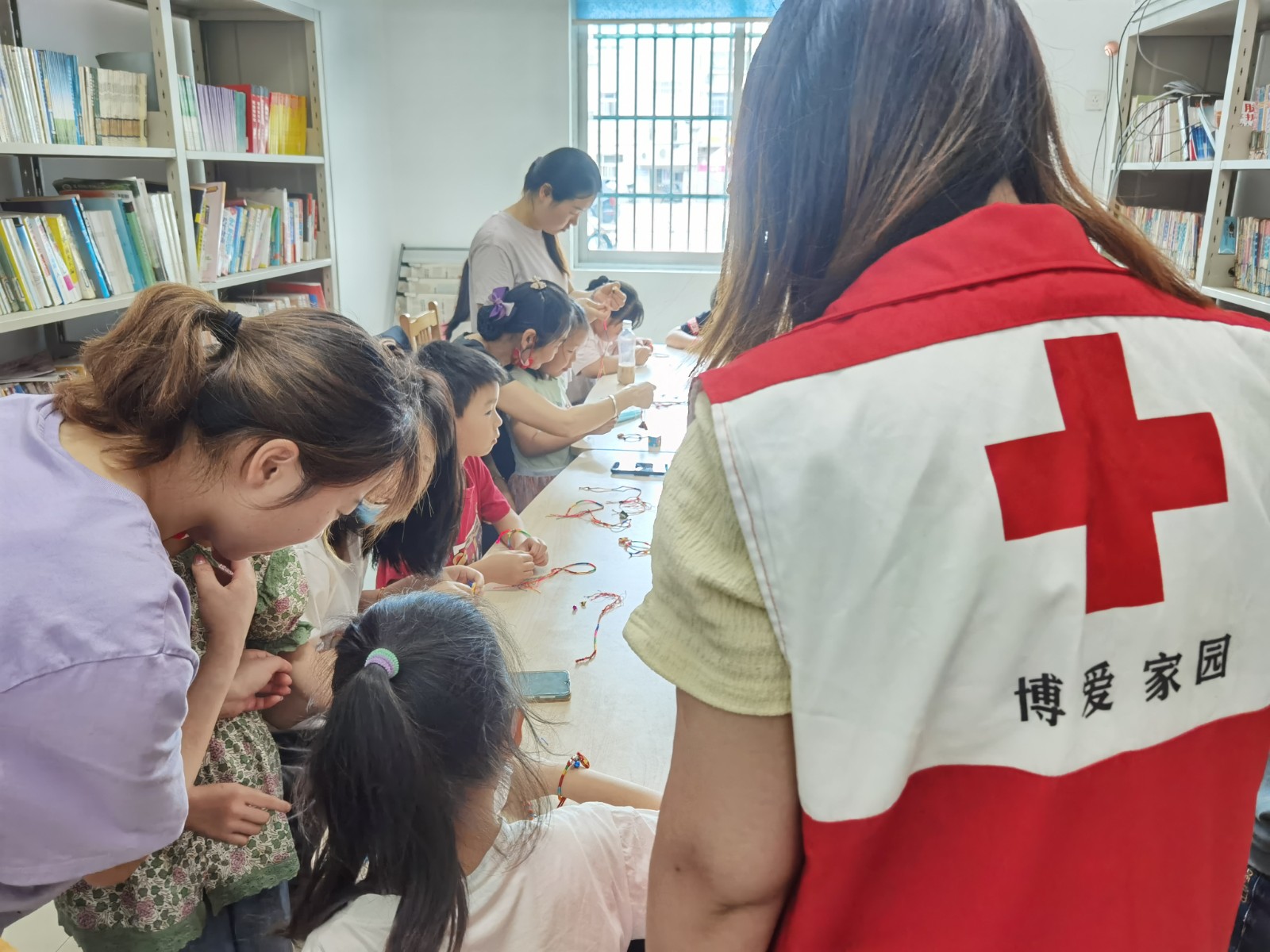活动首先给孩子们播放救护知识有关的小视频,随后社区红十字志愿者用提前准备好的日常救护相关问题考验小朋友们对救护知识的了解,孩子们在听到问题后纷纷踊跃发言,积极回答。随后是穿手链活动,这个活动考验小朋友们的耐心,大家一边玩一边互相交流串珠心得,会议室充满了孩子们的欢声笑语。