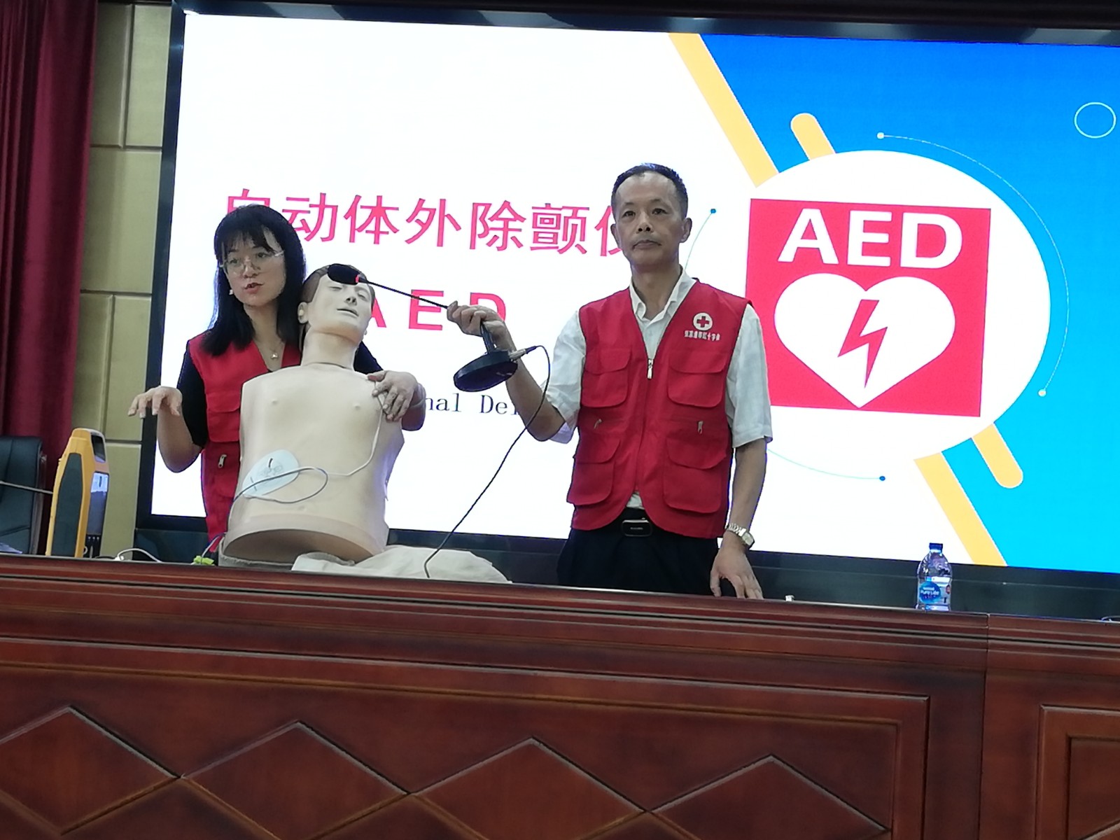 培训课上,红十字救护培训师通过理论、现实案例和实际操作,介绍了心肺复苏、海姆立克急救法以及AED机使用方法。现场学员积极互动,气氛活跃。
