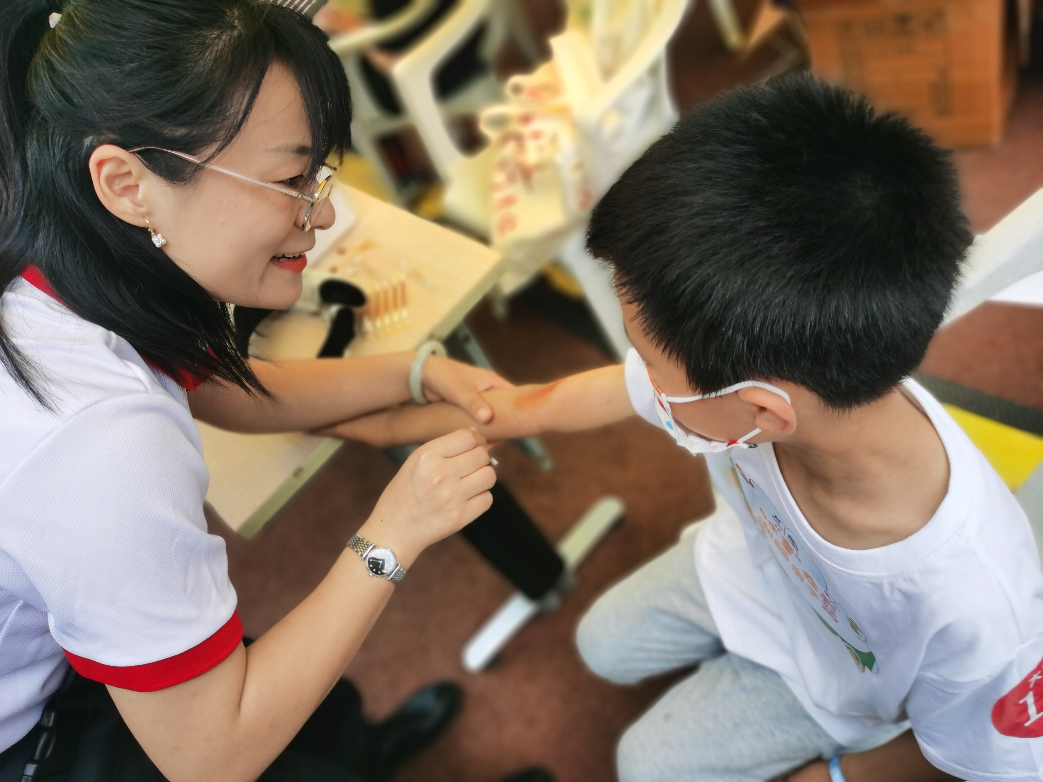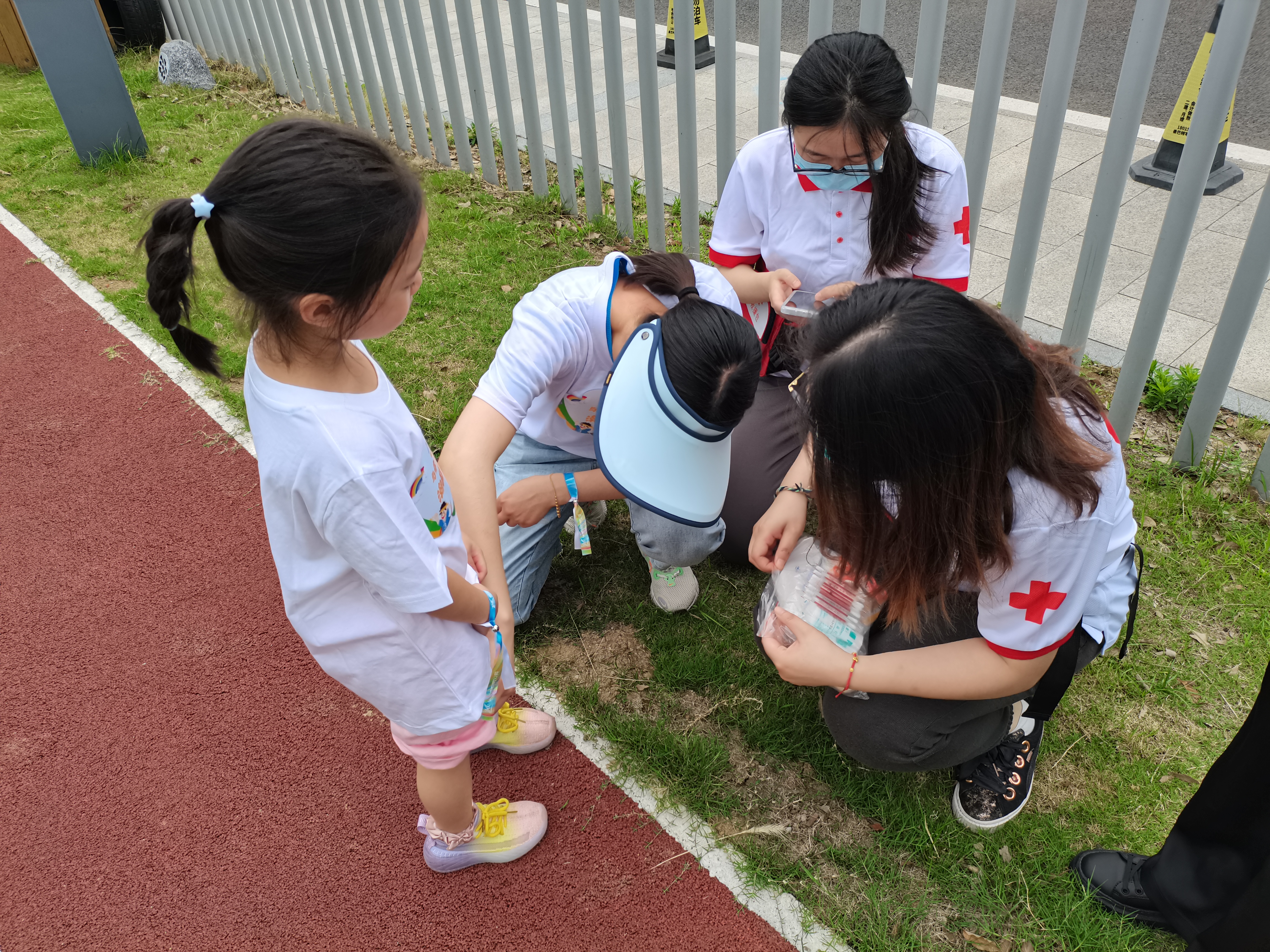 迎着仲夏的气息,伴随着孩子们的欢声笑语 ,小小运动员和爸爸妈妈整装待发,一起体验亲子运动的快乐。活动进行中,磕磕碰碰在所难免,看到小朋友们有擦伤、脚扭伤等意外,红十字救援人员及时上前为他们提供救护。