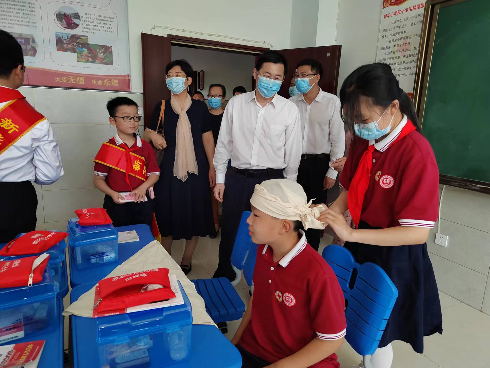 齐敦品一行现场察看了新沂市新华小学红十字示范校建设情况、观看了少先队员急救包扎、心肺复苏等急救技能操作、参加了红十字主题班会;随后来到到瓦窑镇瓦窑村进行实地调研,了解“博爱家园”工作开展情况;到阿湖镇桃岭村调研爱心洗衣坊建设、运行、管理情况,对“红十字爱心洗衣坊”为社区的孤寡、独居、失独和高龄老人提供人道关怀和暖心帮助给予充分的肯定,并要求进一步加大宣传,让爱心洗衣坊发挥更大的作用。