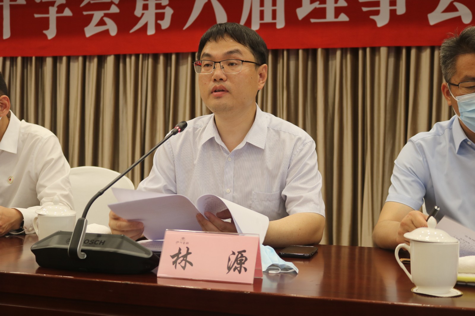市政府办公室副主任、市红十字会兼职副会长林源主持会议并作部分常务理事、理事更换说明。会议选举何剑同志为张家港市红十字会会长,提名黄莺同志担任秘书长。