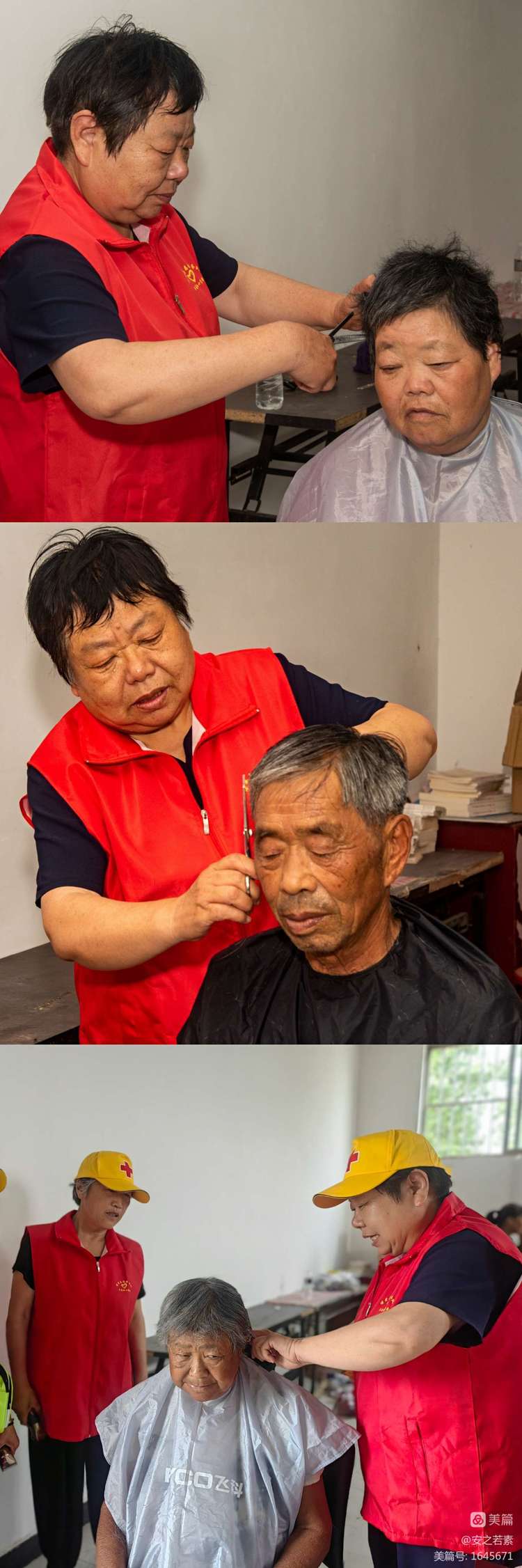 活动现场,志愿者们各司其职,分头行动,有的为已经坐在椅子上等候的老人披上胚布,开始剪头,有的拿出血糖仪、血压仪,为等候多时老人检查身体。