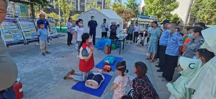 南京市应急救护主任导师史梅兰老师、杨振华老师及区红十字会工作人员为现场居民细心讲解心肺复苏、自动体外除颤仪AED的使用及创伤救护的实践操作。区消防大队宣传员就防火、灭火、逃生、自救等方面进行详细讲解,介绍了火灾发生前后火势的发展情况,以及逃生自救的方法和要点,对如何采取正确的灭火方法和选用合适的灭火器材进行讲解和示范。