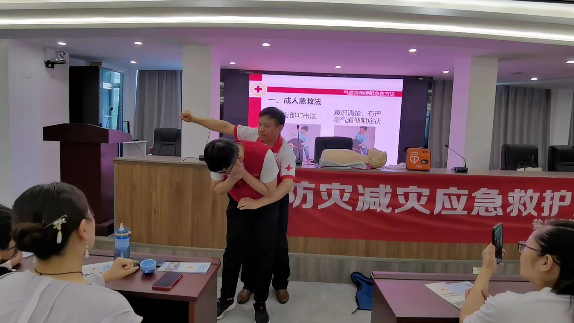 培训过程中,陆老师还通过PPT向家长和学生们介绍了红十字运动基本知识、意外伤害和其他突发事件处置、AED使用和救护概论。讲解图文并茂、通俗易懂、简单可操作,使大家在欢快的气氛中接受了新知识、学到了新技能。