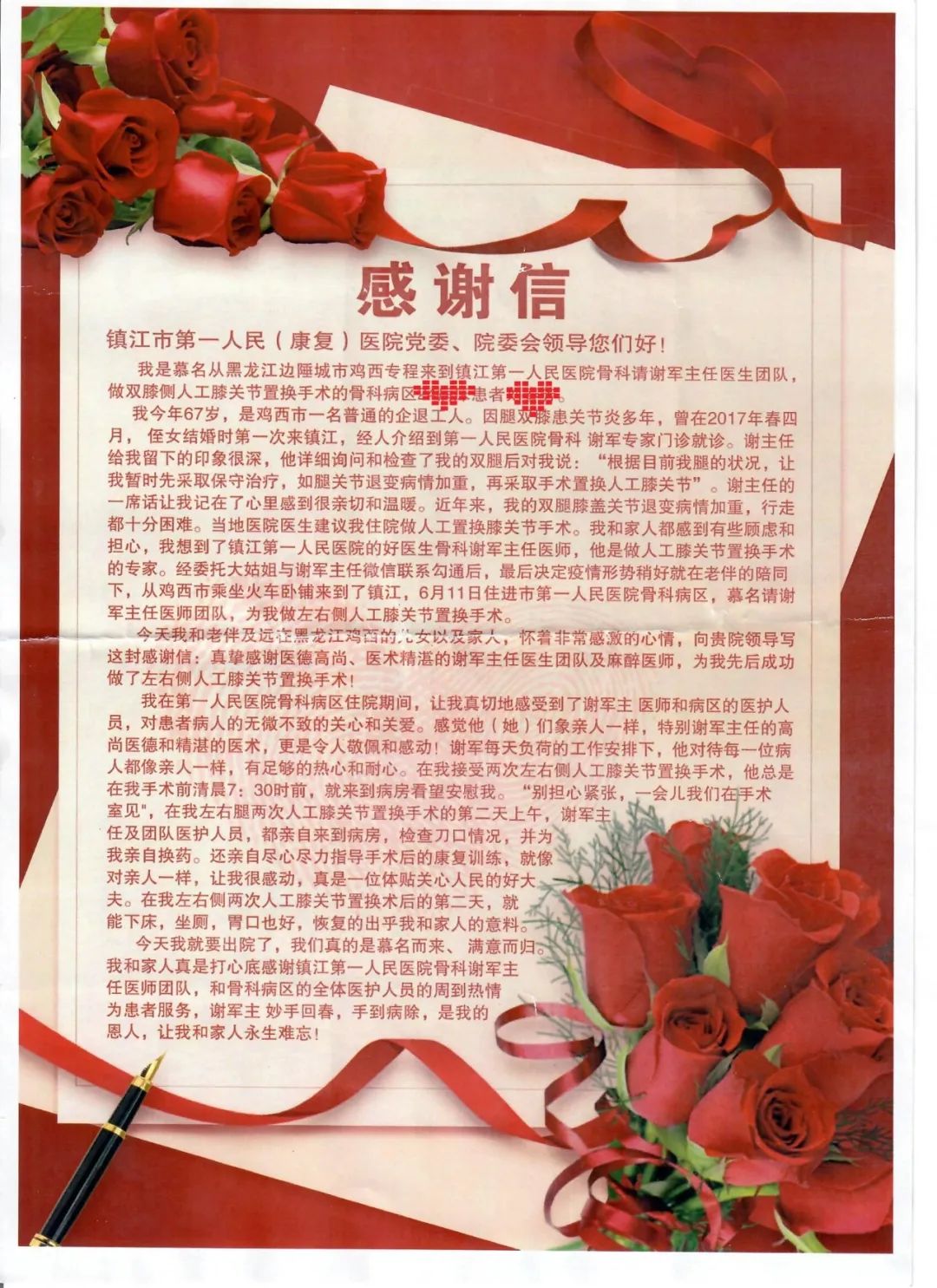 "我先后两次接受人工膝关节置换手术,手术当天7时30分前,谢主任来到病房看望安慰我,让我别担心紧张。"