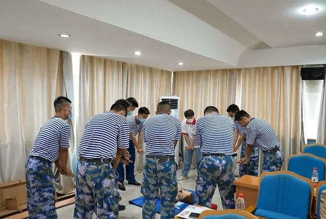 培训期间,救护师采取理论授课、现场操作示范加练习的方式,向官兵详细讲解救护理论及触电、交通事故自救互救等理论知识,演示胸外按压、AED操作使用、气道异物梗阻处置等操作以及三角巾、弹性绷带的使用方法并组织官兵分组进行操作练习。
