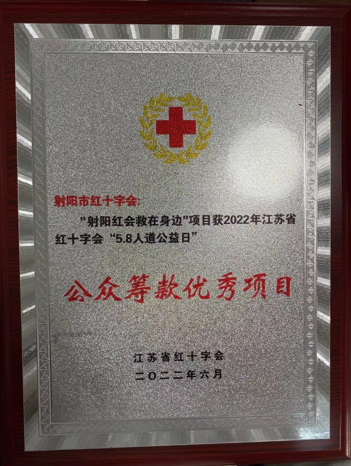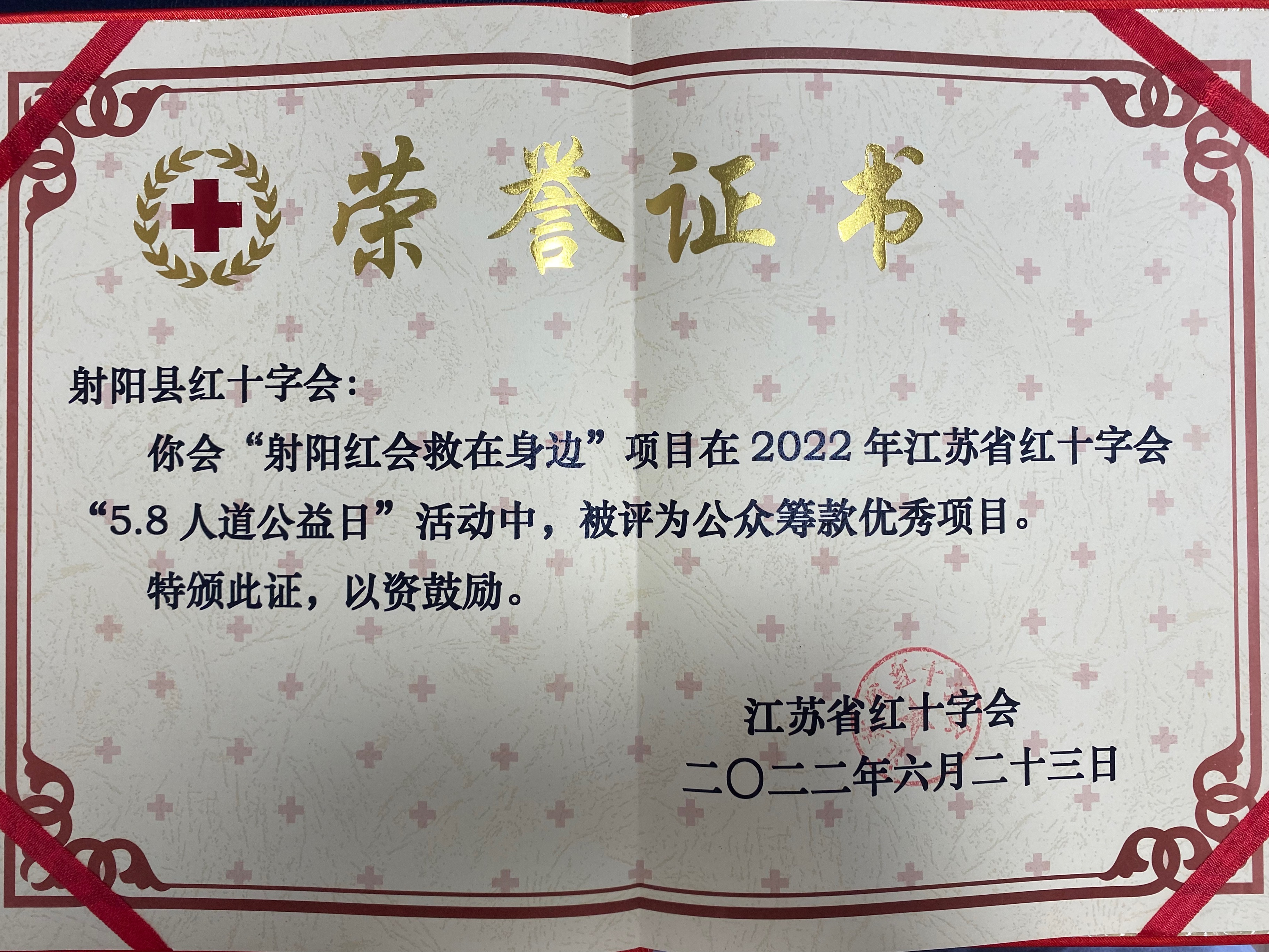 [盐城市]射阳县红十字会荣获2022年江苏省红十字会“5·8人道公益日”公众筹款优秀项目