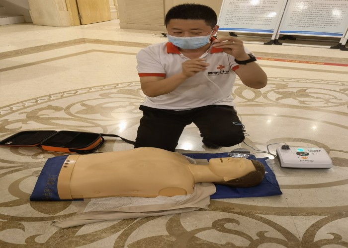 红十字会培训老师向隔离点酒店工作人员细致地讲解了红十字运动与救护基本知识,以及心肺复苏(CPR)和自动体外除颤仪(AED)的使用方法、创伤救护等初级应急救护的核心知识,并利用“模拟人”为大家现场演示了操作流程。工作人员们在老师的指导下依次进行了心肺复苏和自动体外除颤仪的操作,老师对工作人员的实际操作逐人把关、点评。